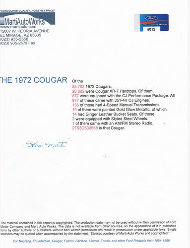 Rare 1 Of 1 Cobra Jet 4-speed 1972 Mercury Cougar Xr7 Authentic Marti-report on 2040-cars
