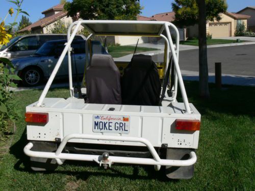 This car is the very best vehicle you can have - if you always wanted a motorcycle but were afraid to ride. No helmet required - your friend can sit next to you, and you can still smell the BBQ & fresh cut grass as you drive through a neighborhood. It is in good enough condition to drive anywhere - like Las Vegas, (range is about 280 miles per tank) but not so pristine that you are afraid to leave it in a parking lot. It has enough power for freeway travel, and to get up into the mountains, enough charm to be in parades & shows, and enough cargo room and agility to be super useful for projects around the house. this car is NOT a numbers-matching preserved authentic heritage vehicle - but the only Chinese parts on it are the seat covers. If you love Moke's this is your chance to get an unusual, unique and super sweet ride you don't have to dump a bunch of money & time into. I have a lot of extra parts - like front grilles in orange, white and purple - which may be available. I have metal - like fender panels and trim - some of which were supposed to have been already used by the last guy who did body work on it. He did it his way, instead of how I requested - and the rust is peeking through after several years. There is certainly room for some improvement = I would put spring suspension in it - but it is very use-able just as it is. ***Please note - the speedo and stated mileage are in KILOMETERS!!! a NOS engine and NOS speedo were installed together during an amateur restoration also involving poor prep pre-paint. SO - in MILES - it is about 10,500, and it goes about 68. One time, late at night on a deserted freeway, going downhill with a tailwind, I think I might have seen 135 (83) for just a second. Or it could have been a gnat in my eye. But I also sometimes have to drive in the margin far right of the slow lane because it can't keep up on extended hills (Cajon Pass). The 998 and other associated mechanical components have all been kept at or near stock configuration.