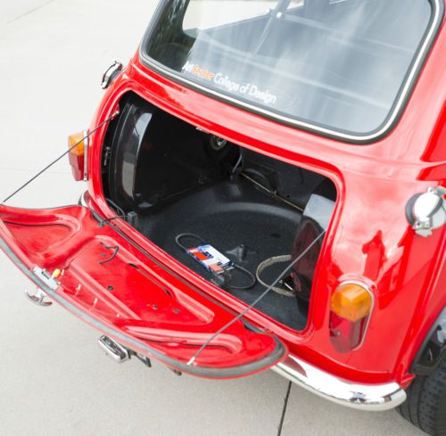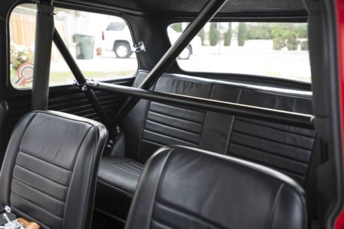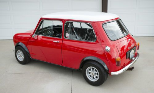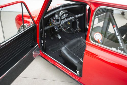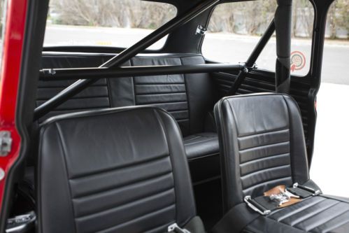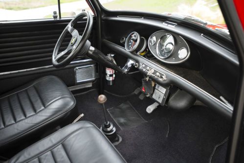 Brakes Front sub-frame powder coated; new rear sub-frame powder coated; wet suspension converted to dry; rebuilt S calipers; Brembo rotors; new output flanges; new pads; Hi/Lo kit; new cones front and rear; Spax adjustable shocks; adjustable tie rods; aluminum Mini Fins; Exterior Hella H4 head lamps with re-chromed bezel rings; genuine Wood & Pickett wheel arch/fender flairs; German BASF paint with clear coat on roof; Interior Black leather seating; Corbeau drivers seat available; 5 point harness for Corbeau seat available; Safety Devices roll cage front and rear; new carpet; Momo leather wrapped steering wheel; all gauges/instruments were rebuilt by North Hollywood Speedometers; Auto Meter tack; miscellaneous new chrome trim pieces; Wheels & Tires Original Mini Lites 10"x 6"; Yokohama A008 tires; Partial list of