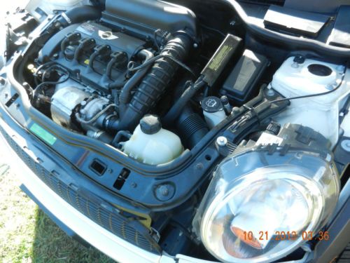 This 2007 mini cooper s was flood damaged out of New York from hurricane Sandy. The water was up to about the seats, not very bad at all. As you can tell from the pictures it was really nice after I completed the water repair. I thought all was great but after driving it for a couple of weeks I had a catastrophic engine failure. Internet info indicates that this is fairly common and is a result of timing chain tensioner failure which allows the valves and pistons to collide. Make no mistake this Mini is nearly flawless outside and in and will make a great ride for some one that can replace the engine. The body has no damage and the paint shows as new. The tires are nearly new and the suspension and brakes felt as new. The air conditioning , cd and radio, cruise, sunroof all worked well Shipping is the responsibility of the buyer.. Terms of sale are $500 by paypal within 24 hours of auction end. Balance by cash, cashiers check or wire transfer before pickup. Since this is non running with a salvage title there is no warranty. I can be reached at 304-481-6248 most any time and will be glad to answer any questions