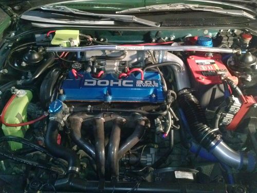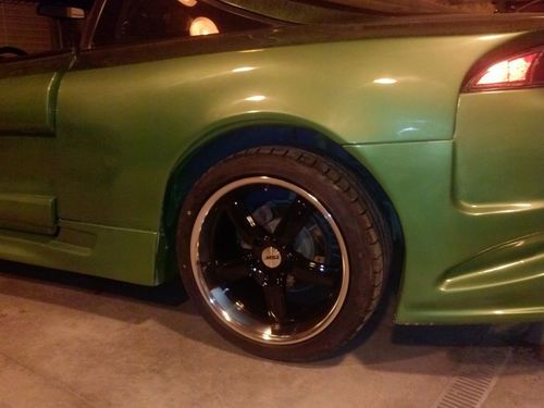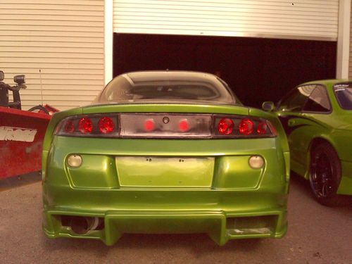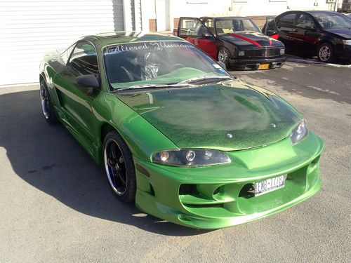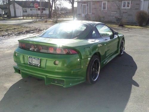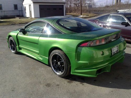1999 Mitsubishi eclipse gs. Has a custom nx wide body kit with bomex front and rear bumpers. custom two tone green and grey lace paint. Green fiberglass dash with built in volt, water temperature, oil pressure, gauge cluster and fire extinguisher. black and green lace door panels. racing seats with 5 point harness. push button start, quick release steering wheel, door poppers, keypad entry, flip up screen radio, new tsw rims and tires with about 500 miles on them. 2.0l dohc (naturally aspirated) with a 5 speed manuel transmission. New struts at all four corners. car runs like new very meticulously maintained.