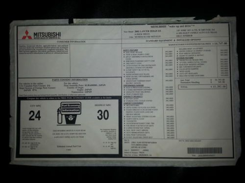 This is a one-owner 2002 Mitsubishi Lancer ES with just under 70,000 miles. This is a very clean and smoke free car. The paint still shines with a good wash and wax. There is no body damage or rust. Everything on the car works as it should, including the AC which still blows cold. An after-market Pioneer cd player/radio was installed replacing the original factory radio. The Pioneer unit is Ipod/IPhone compatible, which is the reason why it was installed. A new exterior antenna was just installed. The car has one-year old 80,000 mile Pirelli tires with tons of tread left to go. The car starts right up and runs great. It still has the original timing belt. There was a transmission problem at about the 40,000 mile mark, but it was repaired by an authorized dealer. The oil and oil filter have been changed every 3,000 miles. The motor remains strong and problem free. This is a domestic sale only. Winning bidder must deposit $500.00 in PayPal account within 48 hours of auction end. Balance is due within seven (7) days of auction end. Balance payment must be cash or a certified payment. Seller is willing to assist with buyer's shipper for vehicle pick-up. Serious bidders only please. We are happy to answer any questions. Happy bidding. It's a great little car with a lot of room inside!