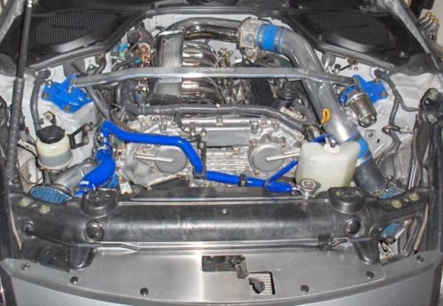 Real Street Performance 2003 Twin Turbo 350 Z Engine: Greddy Twin Turbo, Haltech Platinum Pro Stand alone EMS, Kelford Cams, CP Pistons, Eagle Rods, Ferrea Valves, Springs, etc. Port/Polish Head, RC 1000 cc Injectors, Injected Performance Fuel System, ACT 6 puck Clutch, ACL Main and Rod Bearings, ARP Main and Head Studs, Greddy Polished Intercooler, Wastegates, Boost Gauge, Profec B Spec II Boost Controller, and Turbo Timer. AEM-Wideband Gauge, HKS B.O.V., Unorthodox Drilled Billet Racing Pulley’s. Kinetix Polished Intake Plenum. NGK Plugs, B&M Billet Speed Shifter, Greddy Polished Front Strut Bar. Hyperwire Grounding Wire Kit. Mobil1 full synthetic oil every 3-4 K miles. Exhaust: AAM 3 inch Test Pipes, AAM 3 in. Max Flow True Dual