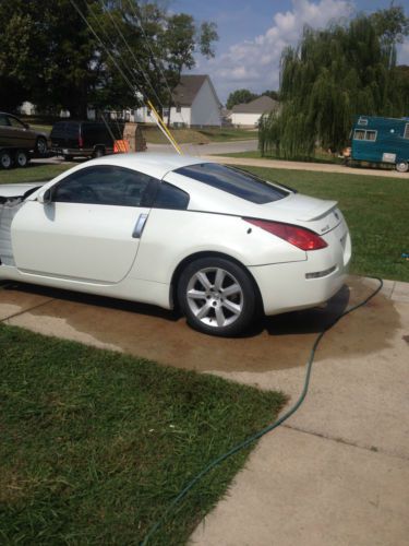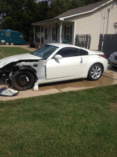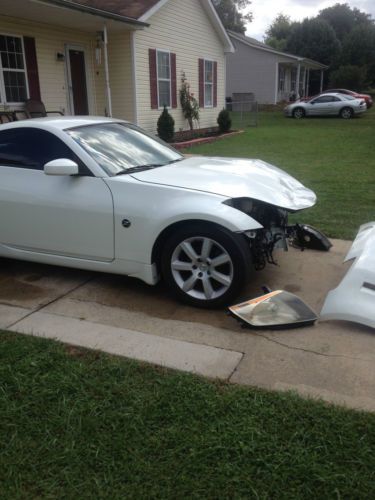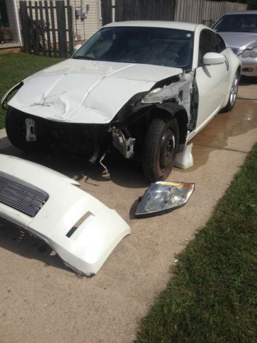 I am selling a 2004 Nissan 350z that has been wrecked in the front end. The vehicle drove fine before the accident. I bought this car to put back together myself but quickly found out that I got in a little over my head. It needs pretty much everything from the core support up; fender, hood, and I think a driver side frame horn. It does still run and I have a video clip of it starting and running but I am not certain of how to load it so if you email me, I will send it to you. I also do have the 4th wheel. All the parts I have come with the car. If you have any questions feel free to ask. I will not ship this car. If you choose to have a shipper pick it up, I will do everything I can to help but any arrangements are the buyers responsibility. Thanks for looking and good luck bidding.
