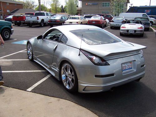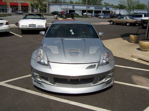 This is a stunning example of Nissan commitment to high performance vehicles. The Z Series has long been known for there undisputed dedication in performance sports cars. This 350Z has been very tastefully upgraded with the right modifications to give it the stellar looks and performance without sacrificing dependability. The exterior of this 350Z is near perfect. The paint is perfect and deep. It has been recently repainted to insure that the JP Aerodynamics design body kit matched the exterior body color. The exterior modifications includes a fiber hood with air louvers and matching front & rear bumper kit, Fiberglass low rise whale tail and lower body side kit to give this 'Z' that ultra low ground hugging look. The suspension has been lowered by 1.5 inches using new lowering springs, the chrome plated alloy wheels are sporting high performance 20' Kumho tires. The engine remains stock except for the lower high flow air plenum runner which is topped off with a matching polished aluminum high flow upper plenum with chrome plated mounting hardware. The K&N cold air intake finishes off the engine breathing system. The exhaust has a high flow straight through stainless exhaust with silencing tips. Modifications have been done to be sure that CEL does cry foul. The interior has cloth seating surfaces with an outstanding AV system with a high wattage amplifier and 12' sub-woofers mounted where the spare tire was. We have retained the original Cubby Door so that if you ever wanted to remove the Video screen, you have the original part to reinstall. The Head and Tail lamps are LED style aftermarket replacements. The owner has invested over $12,000 in upgrades over the stock price of a 350Z. With its low mileage, this is the Nissan 350Z SHOW CAR you have been looking for. We have mechanically inspected this vehicle and there are no mechanical issues that need repair. The only upgrades needed to finish this 350Z is a set of Tu-tone leather seat covers in black with silver buckskin inserts with the 'Z' emblem sewn in the back upper seat back and Brembo brake system from a Infinity G35. Please contact our sales department to ask any questions or to schedule a test drive at 630-852-7821 or 630-852-7821.