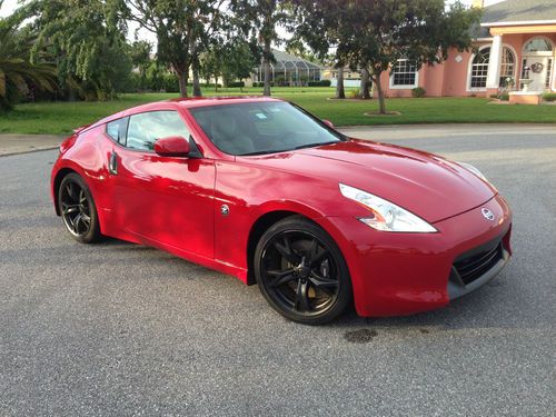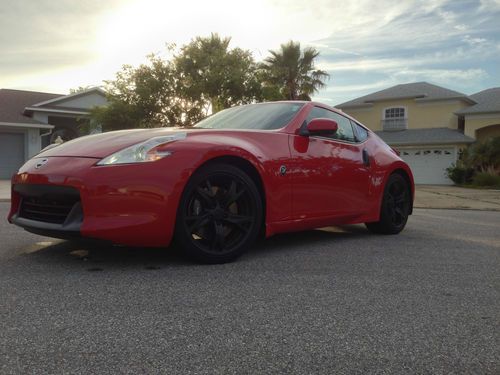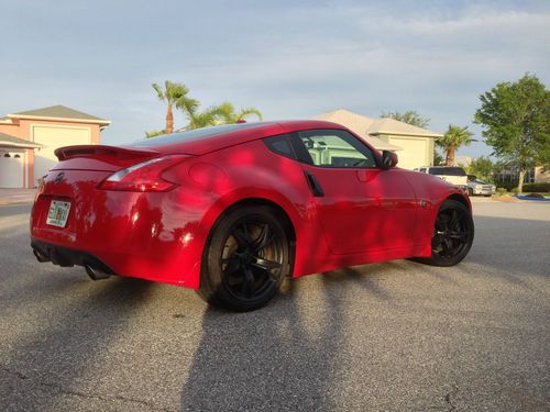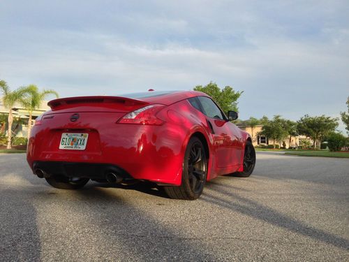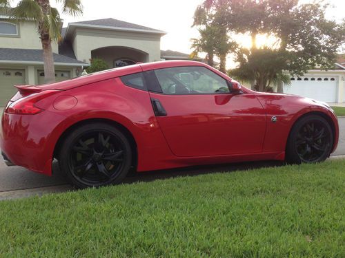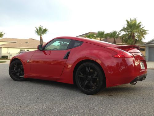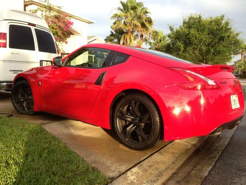 This is a 2009 Nissan 370Z, it has a 6 speed manual transmission with the Touring and Sport package. The Touring package includes leather heated seats, and suede door panels, also a 7 speaker Bose sound system with a factory subwoofer. The sport package adds 19 inch premium Rays Forged rims and Nissan big sport brakes. This car also has the Synchro-rev function that automatically revs the engine when downshifting. I have plastidipped the rims, front chin, and rear valence. It is completely and easily removable, takes about 2 seconds. They are plastidipped matte black and looks amazing in contrast with the red body. Again it is completely removable back to the stock look, plastidip just peels off. Car is clean and kept that way, everything runs strong at 104,xxx miles.