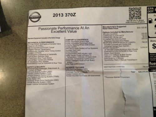 2013 Nissan 370Z, 4270 miles, garage kept, like new, options include; splash guards, carpeted floor mats, carpeted trunk mat, illuminated kick plates, review mirror back-up camera (includes compass and Homelink garage door opener), sport package (includes 19" wheels, sport brakes, front chin deflector and rear spoiler, limited slip differential, sport shocks, and synchrorev match manual transmission).