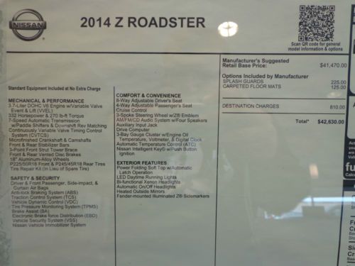 THANK YOU FOR VIEWING OUR BRAND NEW, 2014 NISSAN 370Z ROADSTER COUPE CONVERTIBLE 3.7L V6 REAR WHEEL DRIVE AUTOMATIC TRANSMISSION WITH BLACK POWER FOLDING SOFT TOP ROOF, PADDLE SHIFTERS, PUSH BUTTON IGNITION, ETC IN MAGNETIC BLACK METALLIC PAINT WITH BLACK FABRIC SEATS AND 7 ACTUAL MILES! WE ARE A NISSAN DEALERSHIP IN WESTERN PENNSYLVANIA AND THIS NEW 2014 370Z ROADSTER COUPE CONVERTIBLE HAS A MSRP OF $42,630. WE ARE OFFERING THIS FULLY LOADED 370Z AT A FIRM, DISCOUNTED 'BUY IT NOW' PRICE ON EBAY FOR A VERY LIMITED TIME. PLEASE VIEW THE COMPLETE LISTING INCLUDING 24 PHOTOS. PLEASE CONTACT SCOTT LONG @ (866)467-8395 OR (814)659-1908 OR EMAIL TO LAUFORD@AOL.COM WITH ANY QUESTIONS. THANK YOU FOR VIEWING AND BE SURE TO VIEW ALL OF OUR EBAY LISTINGS! ALSO CHECK OUT OUR 100% POSITIVE FEEDBACK! WARRANTY THE NEW OWNER WILL RECEIVE THE NEW NISSAN WARRANTY WHICH IS A 3 YEAR / 36,000 MILE BUMPER TO BUMPER WARRANTY PLUS A 5 YEAR / 60,000 MILE POWERTRAIN WARRANTY. THIS IS VALID AT ALL NISSAN DEALERSHIPS NATIONWIDE! WE ALSO OFFER EXTENDED WARRANTIES, PLEASE CALL OR EMAIL FOR PRICING AND DETAILS. SCOTT LONG (866)226-0570 - TOLL-FREE (814)659-1908 - CELL PHONE VICE PRESIDENT OF INTERNET OPERATIONS / EBAY SPECIALIST FORD-LINCOLN-NISSAN TOYOTA-SCION-BMW CHRYSLER-JEEP-HYUNDAI DODGE-RAM TRUCK-EQUUS FAX (814)269-2346 EMAIL lauford@aol.com The top 5 reasons why our customer's travel hundreds and even thousands of miles to purchase from US instead of their local dealer: 1. Each of our vehicle's go through a multipoint 160 point inspection, and each vehicle has a unique description which I do personally on every vehicle. 3. Deal directly with a Manager and eliminate the salesperson! NO BACK & FORTH! I specialize in handling ALL Ebay transactions and I personally inspect the vehicle and take all photos & videos. Most of our customers have never purchased a vehicle through Ebay or over the internet and I am dedicated to walk you through the entire process from start to finish and make it a smooth and easy transaction. 4. We are set up to cater to the eBay buyer, and our main focus is selling cars in this market. 5. Each vehicle has a 100% Satisfaction guarantee! Check our 100% perfect feedback on ebay! (Ebay Seller since 2002!!!)