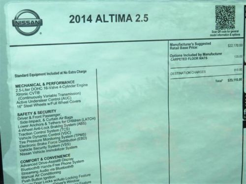 The 2014 Nissan Altima is a car that must be experienced. Its dramatic curves, gorgeously sculpted steel and wide stance adds up to form a car that is exciting to drive, extremely aerodynamic, and slices through the air with ease. Nissan gives you seven tempting Altima trims to choose from starting with the base 2.5 all the way up to the top-of-the-line 3.5 SL. The 2.5 models all share a 2.5-Liter 4-Cylinder engine with 182 Horsepower that gets an EPA estimated 27 MPG City and 38 MPG Highway. The 3.5 Models on the other hand deliver a thrilling 270 Horsepower from a more powerful 3.5-Liter V6, and get an EPA estimated 31 MPG highway. All models come standard equipped with the amazing Xtronic CVT transmission. Inside the 2014 Altima, the cabin is spacious, modern and notably upscale with high-end materials and soft lines. For comfort, Nissan developed extremely comfortable front seats that are not only supportive, their cushions also flex in accordance with your pressure points, to help reduce fatigue while driving. The Altima comes standard with power door locks, push-button start, and an AM FM CD radio with an auxiliary input. Also, you get Bluetooth wireless music streaming and hands-free calling when used with a compatible phone. Not to be overlooked is the Advanced Drive-Assist Display between the speedometer and tachometer. Depending on the trim level and how your Altima is equipped, the display can show you such things as caller ID, turn-by-turn navigation, low tire pressure alerts, and lane departure warnings directly in front of you reducing the time you have to look away. SV and SL trims have the option of purchasing the available Technology Package. It gives you Lane Departure Warning, Blind Spot Warning and Moving Object Detection, as well as the Nissan Navigation System with voice recognition and a 7-inch touchscreen monitor. For Safety, all 2014 Altimas come with Anti-lock brakes, Traction Control, Zone Body construction, and 6 airbags. Wesley Chapel Nissan offers a great selection of cars, trucks, and sport utilities. Our Internet Pricing policy offers low prices, plus we offer a wide variety of financing terms. Call our Internet Sales Team @ 866-913-9478 day or night ! Print this page out and present to a Internet Sales Team member and get a extra $250.00 off!