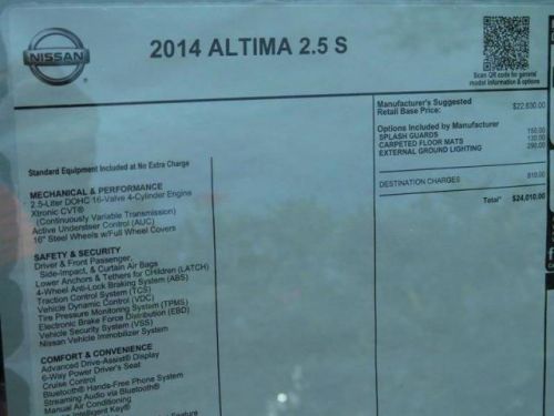 The 2014 Nissan Altima is a car that must be experienced. Its dramatic curves, gorgeously sculpted steel and wide stance adds up to form a car that is exciting to drive, extremely aerodynamic, and slices through the air with ease. Nissan gives you seven tempting Altima trims to choose from starting with the base 2.5 all the way up to the top-of-the-line 3.5 SL. The 2.5 models all share a 2.5-Liter 4-Cylinder engine with 182 Horsepower that gets an EPA estimated 27 MPG City and 38 MPG Highway. The 3.5 Models on the other hand deliver a thrilling 270 Horsepower from a more powerful 3.5-Liter V6, and get an EPA estimated 31 MPG highway. All models come standard equipped with the amazing Xtronic CVT transmission. Inside the 2014 Altima, the cabin is spacious, modern and notably upscale with high-end materials and soft lines. For comfort, Nissan developed extremely comfortable front seats that are not only supportive, their cushions also flex in accordance with your pressure points, to help reduce fatigue while driving. The Altima comes standard with power door locks, push-button start, and an AM FM CD radio with an auxiliary input. Also, you get Bluetooth wireless music streaming and hands-free calling when used with a compatible phone. Not to be overlooked is the Advanced Drive-Assist Display between the speedometer and tachometer. Depending on the trim level and how your Altima is equipped, the display can show you such things as caller ID, turn-by-turn navigation, low tire pressure alerts, and lane departure warnings directly in front of you reducing the time you have to look away. SV and SL trims have the option of purchasing the available Technology Package. It gives you Lane Departure Warning, Blind Spot Warning and Moving Object Detection, as well as the Nissan Navigation System with voice recognition and a 7-inch touchscreen monitor. For Safety, all 2014 Altimas come with Anti-lock brakes, Traction Control, Zone Body construction, and 6 airbags. Wesley Chapel Nissan offers a great selection of cars, trucks, and sport utilities. Our Internet Pricing policy offers low prices, plus we offer a wide variety of financing terms. Call our Internet Sales Team @ 866-913-9478 day or night ! Print this page out and present to a Internet Sales Team member and get a extra $250.00 off!