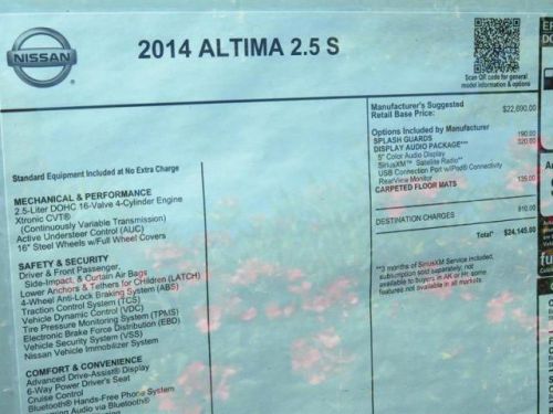 The 2014 Nissan Altima is a car that must be experienced. Its dramatic curves, gorgeously sculpted steel and wide stance adds up to form a car that is exciting to drive, extremely aerodynamic, and slices through the air with ease. Nissan gives you seven tempting Altima trims to choose from starting with the base 2.5 all the way up to the top-of-the-line 3.5 SL. The 2.5 models all share a 2.5-Liter 4-Cylinder engine with 182 Horsepower that gets an EPA estimated 27 MPG City and 38 MPG Highway. The 3.5 Models on the other hand deliver a thrilling 270 Horsepower from a more powerful 3.5-Liter V6, and get an EPA estimated 31 MPG highway. All models come standard equipped with the amazing Xtronic CVT transmission. Inside the 2014 Altima, the cabin is spacious, modern and notably upscale with high-end materials and soft lines. For comfort, Nissan developed extremely comfortable front seats that are not only supportive, their cushions also flex in accordance with your pressure points, to help reduce fatigue while driving. The Altima comes standard with power door locks, push-button start, and an AM FM CD radio with an auxiliary input. Also, you get Bluetooth wireless music streaming and hands-free calling when used with a compatible phone. Not to be overlooked is the Advanced Drive-Assist Display between the speedometer and tachometer. Depending on the trim level and how your Altima is equipped, the display can show you such things as caller ID, turn-by-turn navigation, low tire pressure alerts, and lane departure warnings directly in front of you reducing the time you have to look away. SV and SL trims have the option of purchasing the available Technology Package. It gives you Lane Departure Warning, Blind Spot Warning and Moving Object Detection, as well as the Nissan Navigation System with voice recognition and a 7-inch touchscreen monitor. For Safety, all 2014 Altimas come with Anti-lock brakes, Traction Control, Zone Body construction, and 6 airbags. Wesley Chapel Nissan offers a great selection of cars, trucks, and sport utilities. Our Internet Pricing policy offers low prices, plus we offer a wide variety of financing terms. Call our Internet Sales Team @ 866-913-9478 day or night ! Print this page out and present to a Internet Sales Team member and get a extra $250.00 off!