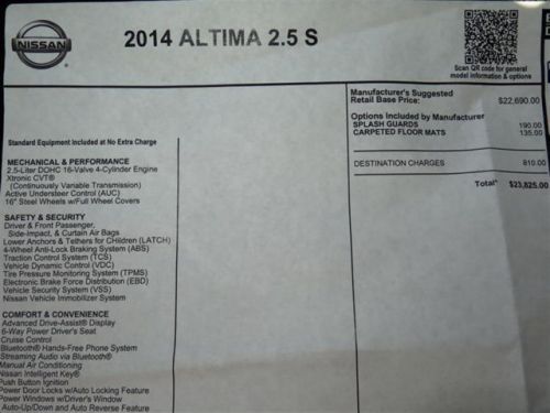 The 2014 Nissan Altima is a car that must be experienced. Its dramatic curves, gorgeously sculpted steel and wide stance adds up to form a car that is exciting to drive, extremely aerodynamic, and slices through the air with ease. Nissan gives you seven tempting Altima trims to choose from starting with the base 2.5 all the way up to the top-of-the-line 3.5 SL. The 2.5 models all share a 2.5-Liter 4-Cylinder engine with 182 Horsepower that gets an EPA estimated 27 MPG City and 38 MPG Highway. The 3.5 Models on the other hand deliver a thrilling 270 Horsepower from a more powerful 3.5-Liter V6, and get an EPA estimated 31 MPG highway. All models come standard equipped with the amazing Xtronic CVT transmission. Inside the 2014 Altima, the cabin is spacious, modern and notably upscale with high-end materials and soft lines. For comfort, Nissan developed extremely comfortable front seats that are not only supportive, their cushions also flex in accordance with your pressure points, to help reduce fatigue while driving. The Altima comes standard with power door locks, push-button start, and an AM FM CD radio with an auxiliary input. Also, you get Bluetooth wireless music streaming and hands-free calling when used with a compatible phone. Not to be overlooked is the Advanced Drive-Assist Display between the speedometer and tachometer. Depending on the trim level and how your Altima is equipped, the display can show you such things as caller ID, turn-by-turn navigation, low tire pressure alerts, and lane departure warnings directly in front of you reducing the time you have to look away. SV and SL trims have the option of purchasing the available Technology Package. It gives you Lane Departure Warning, Blind Spot Warning and Moving Object Detection, as well as the Nissan Navigation System with voice recognition and a 7-inch touchscreen monitor. For Safety, all 2014 Altimas come with Anti-lock brakes, Traction Control, Zone Body construction, and 6 airbags. Wesley Chapel Nissan offers a great selection of cars, trucks, and sport utilities. Our Internet Pricing policy offers low prices, plus we offer a wide variety of financing terms. Call our Internet Sales Team @ 866-913-9478 day or night ! Print this page out and present to a Internet Sales Team member and get a extra $250.00 off!