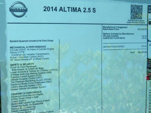 The 2014 Nissan Altima is a car that must be experienced. Its dramatic curves, gorgeously sculpted steel and wide stance adds up to form a car that is exciting to drive, extremely aerodynamic, and slices through the air with ease. Nissan gives you seven tempting Altima trims to choose from starting with the base 2.5 all the way up to the top-of-the-line 3.5 SL. The 2.5 models all share a 2.5-Liter 4-Cylinder engine with 182 Horsepower that gets an EPA estimated 27 MPG City and 38 MPG Highway. The 3.5 Models on the other hand deliver a thrilling 270 Horsepower from a more powerful 3.5-Liter V6, and get an EPA estimated 31 MPG highway. All models come standard equipped with the amazing Xtronic CVT transmission. Inside the 2014 Altima, the cabin is spacious, modern and notably upscale with high-end materials and soft lines. For comfort, Nissan developed extremely comfortable front seats that are not only supportive, their cushions also flex in accordance with your pressure points, to help reduce fatigue while driving. The Altima comes standard with power door locks, push-button start, and an AM FM CD radio with an auxiliary input. Also, you get Bluetooth wireless music streaming and hands-free calling when used with a compatible phone. Not to be overlooked is the Advanced Drive-Assist Display between the speedometer and tachometer. Depending on the trim level and how your Altima is equipped, the display can show you such things as caller ID, turn-by-turn navigation, low tire pressure alerts, and lane departure warnings directly in front of you reducing the time you have to look away. SV and SL trims have the option of purchasing the available Technology Package. It gives you Lane Departure Warning, Blind Spot Warning and Moving Object Detection, as well as the Nissan Navigation System with voice recognition and a 7-inch touchscreen monitor. For Safety, all 2014 Altimas come with Anti-lock brakes, Traction Control, Zone Body construction, and 6 airbags. Wesley Chapel Nissan offers a great selection of cars, trucks, and sport utilities. Our Internet Pricing policy offers low prices, plus we offer a wide variety of financing terms. Call our Internet Sales Team @ 866-913-9478 day or night ! Print this page out and present to a Internet Sales Team member and get a extra $250.00 off!