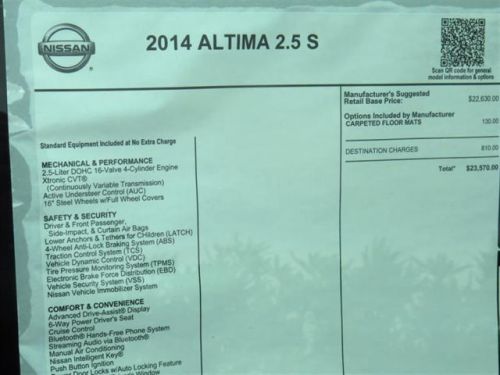 The 2014 Nissan Altima is a car that must be experienced. Its dramatic curves, gorgeously sculpted steel and wide stance adds up to form a car that is exciting to drive, extremely aerodynamic, and slices through the air with ease. Nissan gives you seven tempting Altima trims to choose from starting with the base 2.5 all the way up to the top-of-the-line 3.5 SL. The 2.5 models all share a 2.5-Liter 4-Cylinder engine with 182 Horsepower that gets an EPA estimated 27 MPG City and 38 MPG Highway. The 3.5 Models on the other hand deliver a thrilling 270 Horsepower from a more powerful 3.5-Liter V6, and get an EPA estimated 31 MPG highway. All models come standard equipped with the amazing Xtronic CVT transmission. Inside the 2014 Altima, the cabin is spacious, modern and notably upscale with high-end materials and soft lines. For comfort, Nissan developed extremely comfortable front seats that are not only supportive, their cushions also flex in accordance with your pressure points, to help reduce fatigue while driving. The Altima comes standard with power door locks, push-button start, and an AM FM CD radio with an auxiliary input. Also, you get Bluetooth wireless music streaming and hands-free calling when used with a compatible phone. Not to be overlooked is the Advanced Drive-Assist Display between the speedometer and tachometer. Depending on the trim level and how your Altima is equipped, the display can show you such things as caller ID, turn-by-turn navigation, low tire pressure alerts, and lane departure warnings directly in front of you reducing the time you have to look away. SV and SL trims have the option of purchasing the available Technology Package. It gives you Lane Departure Warning, Blind Spot Warning and Moving Object Detection, as well as the Nissan Navigation System with voice recognition and a 7-inch touchscreen monitor. For Safety, all 2014 Altimas come with Anti-lock brakes, Traction Control, Zone Body construction, and 6 airbags. Wesley Chapel Nissan offers a great selection of cars, trucks, and sport utilities. Our Internet Pricing policy offers low prices, plus we offer a wide variety of financing terms. Call our Internet Sales Team @ 866-913-9478 day or night ! Print this page out and present to a Internet Sales Team member and get a extra $250.00 off!