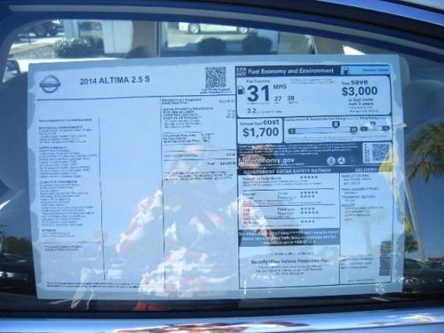 This vehicle has MSRP of $24,495, All the right ingredients! Climb into this trusty Altima and experience the kind of driving excitment that keeps you smiling all the way home! One of the best things about this 2014 Nissan Altima 2.5 S is something you can't see, but you'll be thankful for it every time you pull up to the pump!!! Priced below MSRP!!! The price is the only thing that's been discounted on this ample 2.5 S!!! It has nice optional equipment like: Sport Value Package, Body Side Molding, Floor Mats w/o Trunk Mat (4 Piece)... We have Excellent selection of new Nissan Altima in stock. Please be sure to contact VICTOR, Internet Sales Manager for Professional and No Pressure purchase, additional information and/or pricing on any model Nissan that you are interested in. **** Our goal is to provide the same rich, satisfying experience online that you will receive in our dealership. We pride ourselves on delivering the exceptional treatment customers expect. **** PLEASE Contact - VICTOR Internet Sales Manager for details at 888-505-5074 Thank you for visiting our website.