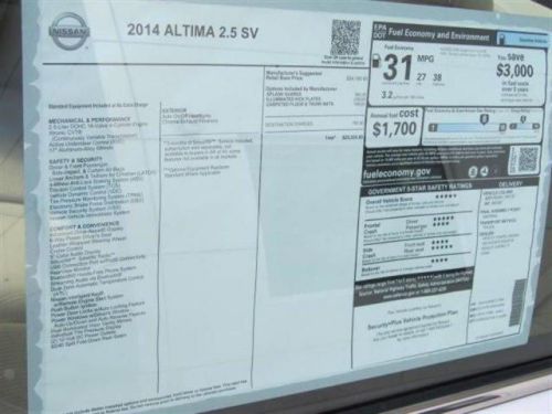 The 2014 Nissan Altima is a car that must be experienced. Its dramatic curves, gorgeously sculpted steel and wide stance adds up to form a car that is exciting to drive, extremely aerodynamic, and slices through the air with ease. Nissan gives you seven tempting Altima trims to choose from starting with the base 2.5 all the way up to the top-of-the-line 3.5 SL. The 2.5 models all share a 2.5-Liter 4-Cylinder engine with 182 Horsepower that gets an EPA estimated 27 MPG City and 38 MPG Highway. The 3.5 Models on the other hand deliver a thrilling 270 Horsepower from a more powerful 3.5-Liter V6, and get an EPA estimated 31 MPG highway. All models come standard equipped with the amazing Xtronic CVT transmission. Inside the 2014 Altima, the cabin is spacious, modern and notably upscale with high-end materials and soft lines. For comfort, Nissan developed extremely comfortable front seats that are not only supportive, their cushions also flex in accordance with your pressure points, to help reduce fatigue while driving. The Altima comes standard with power door locks, push-button start, and an AM FM CD radio with an auxiliary input. Also, you get Bluetooth wireless music streaming and hands-free calling when used with a compatible phone. Not to be overlooked is the Advanced Drive-Assist Display between the speedometer and tachometer. Depending on the trim level and how your Altima is equipped, the display can show you such things as caller ID, turn-by-turn navigation, low tire pressure alerts, and lane departure warnings directly in front of you reducing the time you have to look away. SV and SL trims have the option of purchasing the available Technology Package. It gives you Lane Departure Warning, Blind Spot Warning and Moving Object Detection, as well as the Nissan Navigation System with voice recognition and a 7-inch touchscreen monitor. For Safety, all 2014 Altimas come with Anti-lock brakes, Traction Control, Zone Body construction, and 6 airbags. Wesley Chapel Nissan offers a great selection of cars, trucks, and sport utilities. Our Internet Pricing policy offers low prices, plus we offer a wide variety of financing terms. Call our Internet Sales Team @ 866-913-9478 day or night ! Print this page out and present to a Internet Sales Team member and get a extra $250.00 off!
