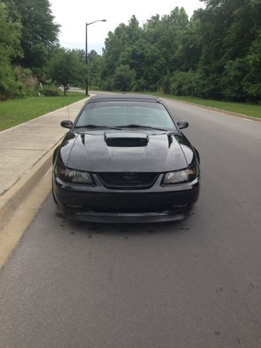 This all Black convertible 5 speed Mustang has been well maintained, garage kept, with several upgrades. It has the Stage 3 Roush suspension, including skid plates to protect the undercarriage. The Black Beauty has 373 gears, BBK Headers, Trick Flow throttle body, SCT Fuel Programmer, 18" Black Rims, leather seats, two 10" Subwoofers in the sleek Mach 1000 trunk box to add premium sound. |