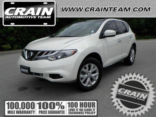 Contact Crain Hyundai of Bentonville today for information on dozens of vehicles like this 2012 Nissan Murano SL AWD. The Nissan Murano is the benchmark all other SUVs strive to meet. With exceptional power, towing and handling, this SUV can handle anything thrown at it. Navigate through all the icky weather with ease in this AWD-equipped Murano, and even get non-stop traction for your non-stop lifestyle! In addition to the amazing traction control, you may even qualify for an insurance reduction with this AWD vehicle. Nissan's Murano stands out as offering one of the most stylish, best-trimmed, and best-appointed interiors from a non-luxury brand, with warm, soft-touch materials and color choices than make some other mainstream-brand crossover models seem drab. The Murano's powertrain, while not overtly sporty, is one of the smoothest and strongest in the segment--great for getting ahead at stoplights and making safe, quick passes on the highway. Ride quality is pretty impressive, especially with the standard 18-inch wheels-- it feels comfortable without being too floaty. This equates to confident handling without fatigue on longer drives. Every new and pre-owned vehicle is backed by the Crain Commitment, including our 100% low price guarantee, a 100 hour love it or leave it exchange policy, and a 100 year 100,000 mile warranty. The Crain Team's Got 'Em! Give us a call at Crain Hyundai of Bentonville 888-292-2234. Combined Crain Hyundai's sales department has over 100 years of experience and dedication in taking care of our customers before and after the sale. We'll do our best to get you into the vehicle you have always wanted, and we strive to make buying or leasing a new vehicle a pleasant and rewarding experience.... That new Hyundai is waiting for you!