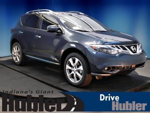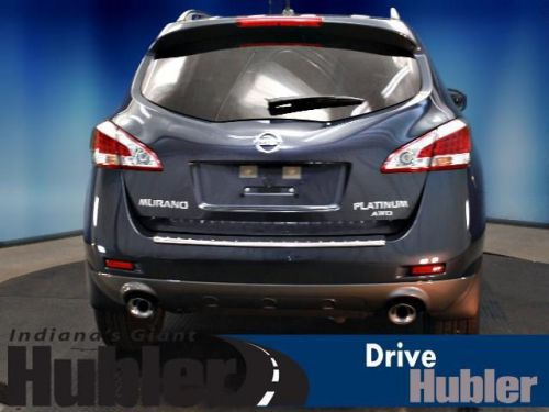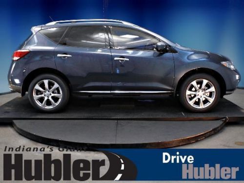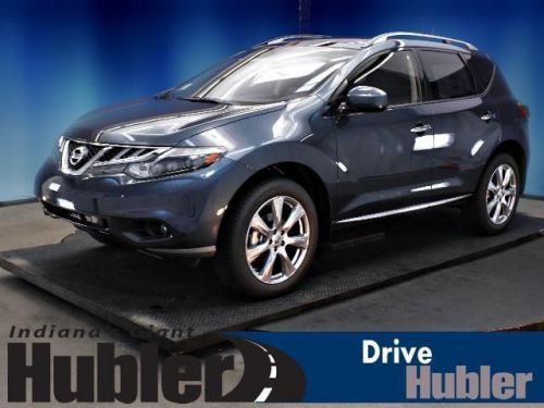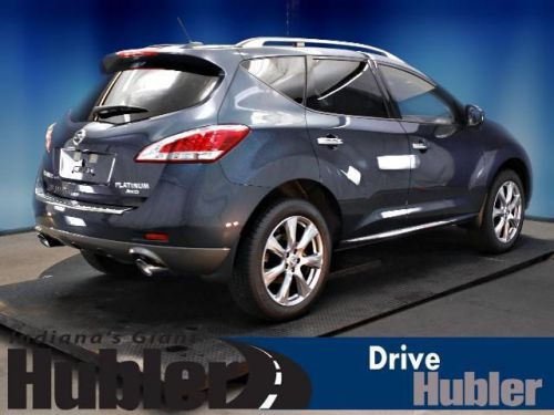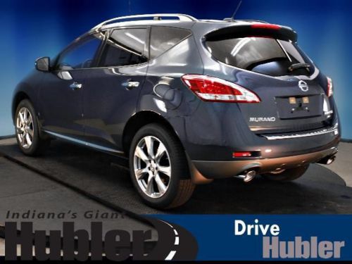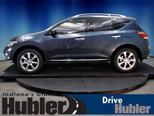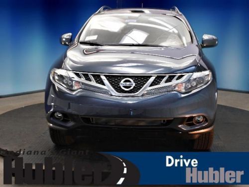 Sunroof, Heated Leather Seats, Heated Rear Seat(s), Rear A/C, Back-Up Camera, Auxiliary Audio Input, Premium Sound System, [B10] SPLASH GUARDS, [G92] MID-YEAR CHANGE. Graphite Blue exterior and Black interior, LE trim. CLICK ME!======KEY FEATURES INCLUDE: Leather Seats, Power Liftgate, Rear A/C, Heated Front Seat(s), Heated Rear Seat(s), Back-Up Camera, Premium Sound System, Auxiliary Audio Input, Dual Moonroof, Keyless Start, Multi-Zone A/C. MP3 Player, All Wheel Drive, Remote Trunk Release, Privacy Glass, Keyless Entry. ======OPTION PACKAGES: PLATINUM PKG: hard drive navigation system w/voice recognition, 7 VGA touch screen, Bluetooth streaming audio, SiriusXM NavTraffic & NavWeather, unique 20 aluminum wheels, bumper protector, blind spot warning, lane departure warning, moving object detection, platinum edition badge, RETRACTABLE CARGO COVER, FRONT/REAR CARPETED FLOOR MATS & CARGO AREA MAT, SPLASH GUARDS, GRAPHITE BLUE, MID-YEAR CHANGE. LE with Graphite Blue exterior and Black interior features a V6 Cylinder Engine with 260 HP at 6000 RPM*. Brand New Tires. ======EXPERTS CONCLUDE: Edmunds.com explains The 2013 Nissan Murano is a well-rounded midsize crossover that offers an engaging driving experience and overall sophistication.. ======OUR OFFERINGS: After more than 50 years in business, The Hubler Auto Group, through the power of ten central Indiana locations, has literally sold hundreds of thousands of vehicles and is one of the oldest and most prolific auto dealers in the State employing 550 people. The Hubler Auto Group can claim the title for selling more G.M. vehicles in the State of Indiana than any other dealer or dealer group, and has earned the right to brag of having the largest and most loyal customer Horsepower calculations based on trim engine configuration. Please confirm the accuracy of the included equipment by calling us prior to purchase. Hubler Nissan is committed to providing the finest automotive ownership experience through superior customer service. Let us make you a "Customer for life". We have 99% Guaranteed Credit Approval! For more details or to schedule an appointment, call us at 888-548-9398.