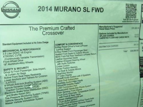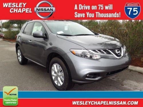 It is the small touches that count. Rear privacy glass, sleek roof rails, available 20 inch aluminum-alloy wheels, and bi-functional xenon headlights on LE models were all added to enhance Murano's distinctive style and breakthrough design. Murano's vehicle structure was specifically built to eliminate noise and vibration, and the well-sealed body gaps and aerodynamic styling reduce wind noise. With the Murano, first class comes standard. The interior features optional heated steering wheel, which warms your hands for comfort and better mobility. Available heated front seats and other unexpected upscale touches offer you and your passengers ultimate comfort and style. The Murano allows front occupants to set their own microclimate with the Dual Zone Automatic Temperature Control. The 3.5-L V6 delivers 260 horsepower and 240 lb-ft of torque to pull ahead of those who would be left behind. Great fuel economy of 24 mpg on the highway means youll be touring for up to 475 miles before needing a fill-up. The Muranos power steering system adjusts sensitivity according to the speed you are traveling. By becoming more nimble at slower speeds, both parking and reversing are made easier. Further customize your driving experience with choice of either front-wheel drive, or an intuitive all-wheel drive system. Nissan is serious about safety and the Murano is no exception. The Nissan Advanced Air Bag System (AABS) includes dual-stage supplemental front air bags with seat belt sensors and an occupant-classification sensor. Also, roof-mounted curtain supplemental air bags help protect you in the event of a side impact or rollover. The Murano LATCH system lets you secure LATCH-compatible child restraints in the second row without having to use seat belts or a locking clip. Experience Murano, Nissans most refined crossover. Wesley Chapel Nissan offers a great selection of cars, trucks, and sport utilities. Our Internet Pricing policy offers low prices, plus we offer a wide variety of financing terms. Call our Internet Sales Team @ 866-913-9478 day or night ! Print this page out and present to a Internet Sales Team member and get a extra $250.00 off!