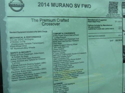 It is the small touches that count. Rear privacy glass, sleek roof rails, available 20 inch aluminum-alloy wheels, and bi-functional xenon headlights on LE models were all added to enhance Murano's distinctive style and breakthrough design. Murano's vehicle structure was specifically built to eliminate noise and vibration, and the well-sealed body gaps and aerodynamic styling reduce wind noise. With the Murano, first class comes standard. The interior features optional heated steering wheel, which warms your hands for comfort and better mobility. Available heated front seats and other unexpected upscale touches offer you and your passengers ultimate comfort and style. The Murano allows front occupants to set their own microclimate with the Dual Zone Automatic Temperature Control. The 3.5-L V6 delivers 260 horsepower and 240 lb-ft of torque to pull ahead of those who would be left behind. Great fuel economy of 24 mpg on the highway means youll be touring for up to 475 miles before needing a fill-up. The Muranos power steering system adjusts sensitivity according to the speed you are traveling. By becoming more nimble at slower speeds, both parking and reversing are made easier. Further customize your driving experience with choice of either front-wheel drive, or an intuitive all-wheel drive system. Nissan is serious about safety and the Murano is no exception. The Nissan Advanced Air Bag System (AABS) includes dual-stage supplemental front air bags with seat belt sensors and an occupant-classification sensor. Also, roof-mounted curtain supplemental air bags help protect you in the event of a side impact or rollover. The Murano LATCH system lets you secure LATCH-compatible child restraints in the second row without having to use seat belts or a locking clip. Experience Murano, Nissans most refined crossover. Wesley Chapel Nissan offers a great selection of cars, trucks, and sport utilities. Our Internet Pricing policy offers low prices, plus we offer a wide variety of financing terms. Call our Internet Sales Team @ 866-913-9478 day or night ! Print this page out and present to a Internet Sales Team member and get a extra $250.00 off!