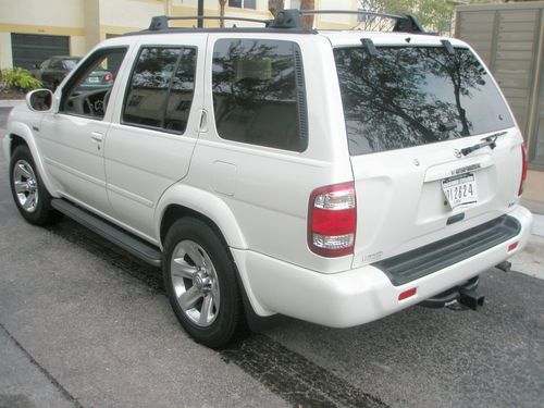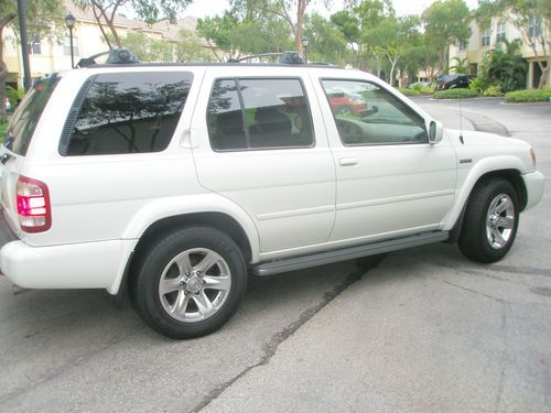 You are bidding on a 2004 Nissan Pathfinder Le 2WD Platinum Edition in Pearl white. This vehicle has had no Paint work. and has been well taken care of. This color is rare and has all the options. Bose 6-disk CD changer, Sunroof, Heated seats, Tan leather interior, Ipod connect, Tow Package, Running boards, rear wiper and many more options. Tires and wheels are both in great shape vehicle is clean and runs and drive great. Clear and Clean title with clean Carfax. Any questions pls. ask. Yes I will ship this vehicle Internationally. Pls ask for shipping quotes if needed.