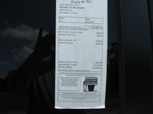 This Nissan is being offered by A-1 auto sales Denison TX I have been in the same Location since 1973 read my feedback, here is why i am selling a brand new rogue This vehicle went on a test drive from the Nissan dealer & they never returned it was stolen it was found a few weeks later in a parking lot it had 59 miles on it, they drove it 59 miles & parked it not a scratch on it still brand new, being a wholesale dealer i was able to purcahse it from the insurance company with 59 miles on it It now has a couple of hundred miles on it from me driving it, It has all factory warranty clean clear original Title, The only diff between buying this one or going to the Nissan dealer is you are saving thousands of dollars buying this one because someone drove it off the lot & put 59 miles on it, there are no dings or scratches or marks on it Its new, 4 cyl, auto, pwr windows, locks,pwr mirrs, rear defogger, tilt, tinted windows, for more info feel free to call David at 903-870-8582 window sticker is $21k On Aug-22-14 at 15:44:38 PDT, seller added the following information: Buy it now price is $16,900 Thats a Deal for someone On Aug-24-14 at 16:25:11 PDT, seller added the following information: I am driving it will have a few hundred more miles on it less than 500 total |