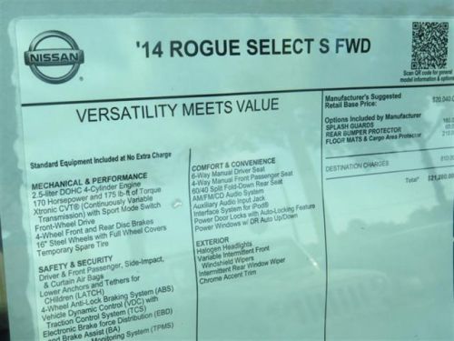 From headlights to taillights the stylish Nissan Rogue maintains a perfect blend of classy and sporty, for a look that's easy-on-the-eyes. The color-matched, aerodynamic rear spoiler helps reduce turbulence and drag while enhancing a sporty appearance. The chrome grille gives your Rogue's exterior the durability it needs while maintaining its shine and available 18 inch 5-split-spoke aluminum-alloy wheels give Rogue just the right amount of sophistication. Cargo versatility is right behind you. The standard 60/40 split fold-down rear seat allows a bigger cargo area with room for longer items. Smart details like illuminated steering wheel audio controls and an ergonomically shaped shift knob make for a rewarding long-term relationship. The Rogue also has a completely integrated interface for your iPod, and an input conveniently located in the center console armrest for easy access. The Rogue is an exercise in practicality and efficiency. The 2.5-liter 4-cylinder engine gets a remarkable 28 MPG (highway) and is backed by 170 horsepower and 175 lb-ft of torque. The Rogues power steering system adjusts sensitivity according to the speed you are traveling. It becomes more nimble at low speeds, making parking and reversing easier. Plus, the intuitive all-wheel drive (AWD) recognizes the difference between various driving conditions and responds accordingly. So you get extra grip when you need it and maximum efficiency when you dont. Protecting the most precious cargo, the Nissan Advanced Air Bag System (AABS) includes dual-stage supplemental front air bags with seat belt sensors and an occupant-classification sensor. Also, roof-mounted curtain supplemental air bags provide head protection for both rows of outboard occupants. Finally, front-seat Active Head Restraints help reduce the chance of whiplash injuries. With the Nissan Rogue you are sure to arrive in style. Wesley Chapel Nissan offers a great selection of cars, trucks, and sport utilities. Our Internet Pricing policy offers low prices, plus we offer a wide variety of financing terms. Call our Internet Sales Team @ 866-913-9478 day or night ! Print this page out and present to a Internet Sales Team member and get a extra $250.00 off!