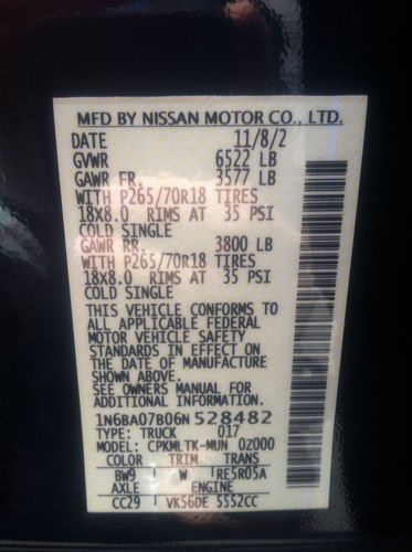 You are bidding on a extremely nice 2006 Nissan Titan SE. This truck is loaded with options. Also has off road fender flares (custom Painted), Rough Country Suspension Lift(6"), Pro-Comp Chrome Wheels and Pro-Comp tires with plenty of tread left. Truck includes a Black tool box, Rough Country Running boards, Grill Guard and much more... The truck was just serviced at the local Nissan Dealership and had the radiator flushed, transmission serviced, air filter changed (inside and outside), oil change and filter, new fan blade and fan clutch... This truck runs and rides great... Its a real head turner... I will ship same anywhere in US (buyer pays) after payment clears. Truck is for sale locally and I reserve the right to end the auction early due to local sell. Happy Bidding:)