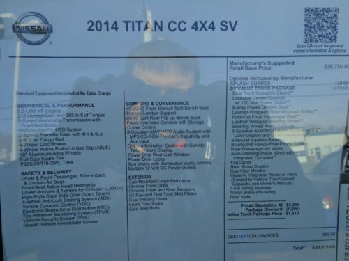 THANK YOU FOR VIEWING OUR BRAND NEW, 2014 NISSAN TITAN SV CREW CAB 5.6L V8 4X4 AUTOMATIC TRANSMISSION WITH TOW PACKAGE, REAR BACKUP CAMERA, BLUETOOTH, ETC IN GALAXY BLACK PAINT WITH CHARCOAL FABRIC SEATS AND 18 ACTUAL MILES! WE ARE A NISSAN DEALERSHIP IN WESTERN PENNSYLVANIA AND THIS NEW 2014 TITAN SV CREW CAB 4X4 HAS A MSRP OF $39,675. WE ARE OFFERING THIS FULLY LOADED TITAN AT A FIRM, DISCOUNTED 'BUY IT NOW' PRICE ON EBAY FOR A VERY LIMITED TIME. PLEASE VIEW THE COMPLETE LISTING INCLUDING 24 PHOTOS. PLEASE CONTACT SCOTT LONG @ (866)467-8395 OR (814)659-1908 OR EMAIL TO LAUFORD@AOL.COM WITH ANY QUESTIONS. THANK YOU FOR VIEWING AND BE SURE TO VIEW ALL OF OUR EBAY LISTINGS! ALSO CHECK OUT OUR 100% POSITIVE FEEDBACK! WARRANTY THE NEW OWNER WILL RECEIVE THE NEW NISSAN WARRANTY WHICH IS A 3 YEAR / 36,000 MILE BUMPER TO BUMPER WARRANTY PLUS A 5 YEAR / 60,000 MILE POWERTRAIN WARRANTY. THIS IS VALID AT ALL NISSAN DEALERSHIPS NATIONWIDE! WE ALSO OFFER EXTENDED WARRANTIES, PLEASE CALL OR EMAIL FOR PRICING AND DETAILS. SCOTT LONG (866)226-0570 - TOLL-FREE (814)659-1908 - CELL PHONE VICE PRESIDENT OF INTERNET OPERATIONS / EBAY SPECIALIST FORD-LINCOLN-NISSAN TOYOTA-SCION-BMW CHRYSLER-JEEP-HYUNDAI DODGE-RAM TRUCK-EQUUS FAX (814)269-2346 EMAIL lauford@aol.com The top 5 reasons why our customer's travel hundreds and even thousands of miles to purchase from US instead of their local dealer: 1. Each of our vehicle's go through a multipoint 160 point inspection, and each vehicle has a unique description which I do personally on every vehicle. 3. Deal directly with a Manager and eliminate the salesperson! NO BACK & FORTH! I specialize in handling ALL Ebay transactions and I personally inspect the vehicle and take all photos & videos. Most of our customers have never purchased a vehicle through Ebay or over the internet and I am dedicated to walk you through the entire process from start to finish and make it a smooth and easy transaction. 4. We are set up to cater to the eBay buyer, and our main focus is selling cars in this market. 5. Each vehicle has a 100% Satisfaction guarantee! Check our 100% perfect feedback on ebay! (Ebay Seller since 2002!!!)