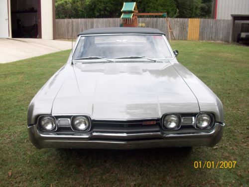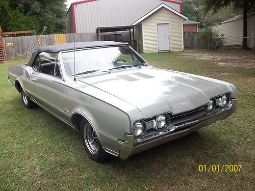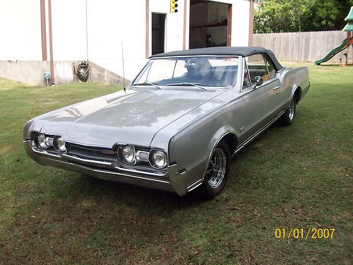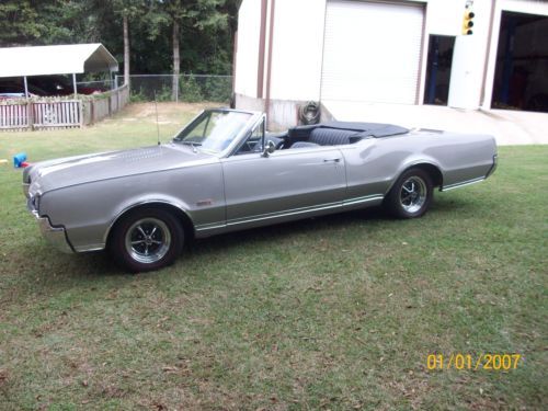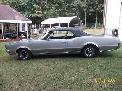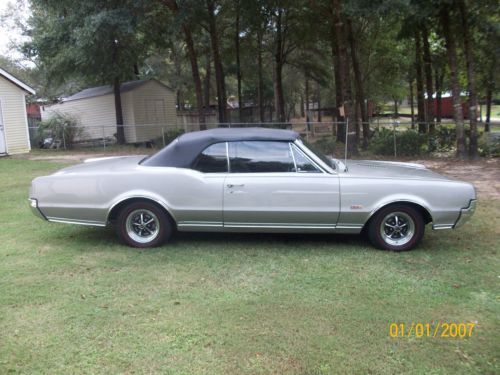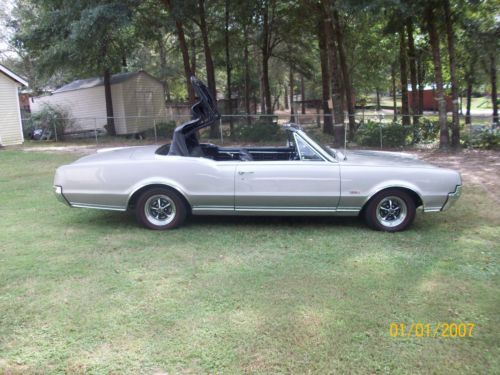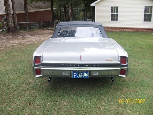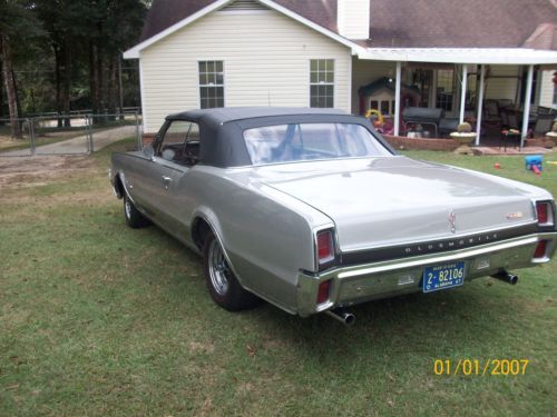 1967 olds 442 convertible very orignal car execpt engine. has 425 cu. in 365 hp. olds engine.pweter silver metallic paint. turbo 400 trsnsmission.dual exaust. power steering, orginal drum power brakes, front and rear sway bars, chrome magum 500 wheels with bf goorrich red wall radials new black convertible top, with parade boot, black interior with bucket seats, new carpet. complet restoration approximately three years ago. doese not have a/c. the car is in very good orginal condition.still has points ,voltage regulator. any questions call 251-591-4878