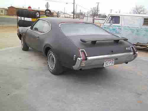 You are bidding on a very Solid And Very high option 1969 442... It has power windows and locks, cruise control, power antenna and rear window defrost option... The body is very solid, the floors and trunk are very solid, and only has very minor rust in the rear quarters, and a very small hole in the drivers side front floor.. About the size of a peanut... The glass is all in great shape, except for the drivers side rear small window, due to the fact that it was busted when someone tried to steal the car, and they also broke the ignition switch, and stole the radiator... The interior is in decent shape but will need to be redone to be nice.. The worst part of the inside is the headliner is torn, but it is there, and the drivers side door panel needs repair, but is also there.. I also pulled out the carpet to check for rust, so there is no carpet, and the seats are not bolted down... The Dash is fully intact and still sports all the original knobs, radio, etc... It Does have a crack right in the middle... The Motor is a 400 V8, And Has What I believe to be a th400 transmission, and I'm not sure if they are original or not, but I do know that the motor sounds great, with no noises, and no smoke... you do have to pour gas in the carb to keep it running, but I think it might just need a fuel pump or something minor, and like I said before, the radiator is missing, although the fan shroud is still intact... So it is Not driveable, and will need to be towed or trailered to its destination... BUYER WILL BE RESPONSIBLE FOR PICKING UP THE CAR OR HAVING IT SHIPPED, AS I DO NOT PROVIDE SHIPPING... ALSO, FULL PAYMENT IS DUE 12 HOURS AFTER SALE AND NEEDS TO BE IN THE FORM OF A CERTIFIED CASHIERS CHECK, OR WIRE TRANSFER TO MY BANK... CASH MONEY IS ALSO GREAT!!! YOU WILL HAVE 7 DAYS TO PICK UP THE CAR AFTER THE SALE!!!! THANKS AND HAPPY BIDDING!!!! (806)215-4395 Text For Any Questions