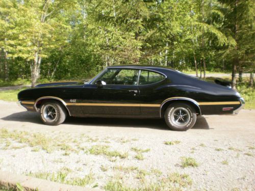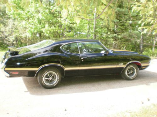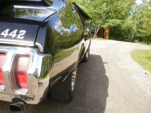 This vehicle is a real 442 with factory 4 speed. The original color of Sherwood Green with Black Stripes and green interior. It has been repainted Ebony black and gold stripes added to make the car a W-30 clone. An original W-30 TO code 12 bolt Oldsmobile O- type posi - traction differential with 3.91 gear ratio is installed. Many original W-30 parts were used from a W-30 parts car. Restored in paint color of Ebony Black,