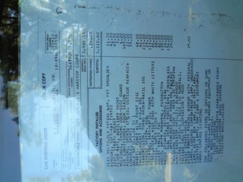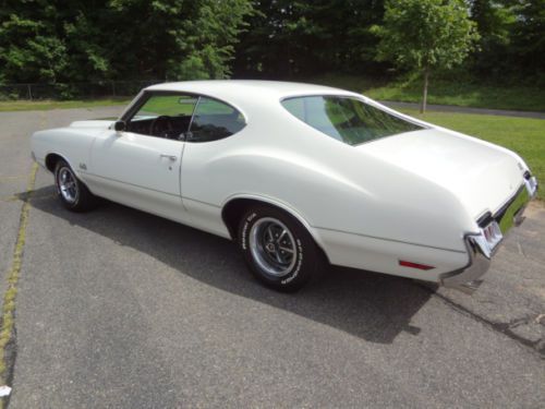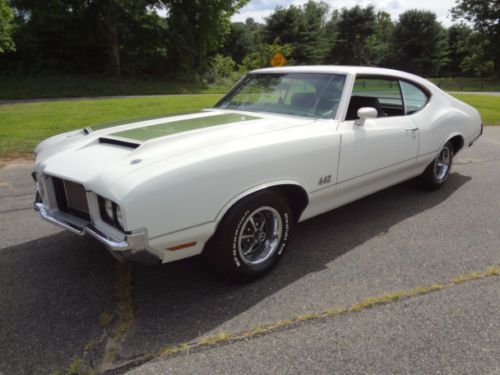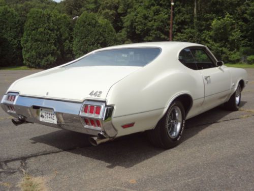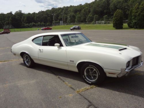 This is a true 1972 Oldsmobile 442. In 1972 Oldsmobile did not have a 442 series but rather a option that you checked when ordering your Olds 442. This car has all the original paperwork that proves what it is. Car was built in Texas and sold out of dealership in Georgia. Have the original window sticker,sales invoice,service records on the car. Has ice cold factory air, new heater core,rallye sport package rebuilt tic,tac,toc gauge,bucket seats,floor shifter,console,AM/FM radio, rare fiberglass air induction hood,hood stripes,350 4barrel carb. Nice white paint with factory original green interior with the original GM seat belts. Car drives and sounds great. Car has over 100,000 original factory miles. The car has all the original sheet metal,floors,trunk,and quarter panels,and still has some of its original paint. The motor was reconditioned,transmission and rear end were professionally rebuilt with an added shifter kit with Richmond 373 gears. New brakes, shocks,suspension parts,tires,exhaust,Edelbrock intake,Holley carb,electronic distributor,Hedman headers and more. The undercarriage is outstanding detailed and painted to look factory new. I also have the original parts from this car after doing the high performance upgrade on the engine. This car is for the true muscle car nut. Price is reduced $25,000.00 for this rare and documented car. I can be reached at 203-870-5248
