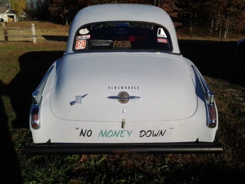 50 OLDS GASSER COOL OLD CAR HAS OLDS REAR WITH 4:10 GEAR STRAIGHT AXLE WITH OLDS BRAKES ON FRONT.MOON TANK TIRES ON FRONT ARE ABOUT A YEAR OLD.REAL MOON DISC ON FRONT.COOL SEAT WITH OLD GAUGES IN DASH.DASH WAS ALSO SIGNED BY GEORGE RAY AT HID RACE TRACK IN ARKANSAS IN 08. ENGINE IS A 324 WITH A ROD KNOCKING.VINTAGE SPEED EQUIPMENT INCLUDING THE DOUGS HEADERS MADE FOR THE OLDS CHASSIS AND STRAIGHT SHIFT BELL HOUSING.NO TRANS.WHEN OLDS ENGINE WENT DOWN WE INSTALLED SBC AND 4 SPEED.CAR COMES WITH OLDS ENGINE ONLY BUT SBC MOUNTS STILL IN CAR.CHEVY PARTS IN TRUNK DO NOT GO.HAVE A CLEAR TITLE.ANY ?'S 270-658-3804 THANKS.
