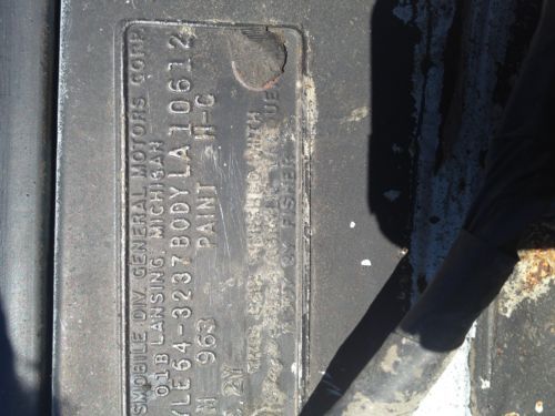 THIS IS A 1964 OLDSMOBILE WEVE HAD FOR 3 YEARS BOUGHT IT TO RESTORE AND DROVE IT AROUND FOR A LITTLE WHILE AND HAPPENED TO RUN ACROSS ONE ALREADY RESTORED AND READY TO GO SO I AM SELLING THIS ONE. THE CAR RUNS AND DRIVES HAS A 330 OLDSMOBILE FACTORY V8 BUT THE TRANSMISSION HAS BEN CHANGED TO A 5SPEED NOT SURE WHAT YEAR OR CAR THE TRANSMISSION CAME OUT OF BUT I DO HAVE PICTURES OF THE BORG WARNER NUMBERS OFF OF THE TRANSMISSION. THE TIRES HAVE DRY ROT BUT THEY ARE BIAS-PLY TIRES AND I WOULD NOT RECCOMEND DRIVING HOME ON THEM. THE CAR HAS SOME RUST THERE IS A FEW SPOTS ON THE FRAME THAT LOOK REPAIRABLE AND IT HAS HAD BOTH QUARTERS WORKED AT SOME TIME AND BONDO WAS PUT IN, THE FRONT FLOOR PANS ARE GOOD BUT THE TRUNK PAN IS NOT IT WILL NEED TO BE REPLACED AND I HAVE PICTURES OF ALL OF THIS AND IF YOU DO NOT SEE THEM ON HERE MESSAGE ME THROUGH EBAY AND I WILL SEND THEM TO YOU. CAR DOES CRANK AND RUN ALL THE GAUGES WORK BUT THE INTERIOR LOOKS TO BE STOCK NON RESTORED AND WILL NEED WORK THE ODOMETER IS SHOWING 7000 AND SOME ODD MILES BUT THIS DONT NOT REFLECT THE MILEAGE AS FAR AS WHATS ON THE CAR I DO NOT KNOW THE ORIGINAL MILES JUST WHAT IS SHOWING ON THE ODOMETER I DO HAVE MORE PICS OF THE CAR WITH A VIDEO ALSO BUT CANT GET THE VIDEO TO POST SO EMAIL ME FOR MORE PICS YOUR CELL PHONE # AND I WILL TEXT YOU THE VIDEO OR MORE PICS THANKS