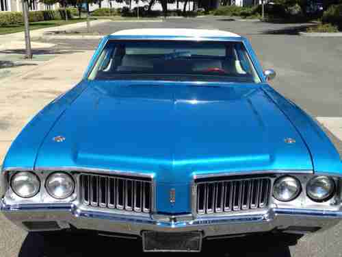 1970 Oldsmobile Cutlass 2dr 350 rocket motor 4 barrel , electronic ignition, 350 automatic transmission. All new original pattern pearl white interior , new black carpet and headliner. New 22" chrome Irocs with new 22" tires. Car has a newer blue metalic paint job with a new pearl white top. This car is a perfect relaible daily driver , not a show car. Runs perfect and is a turn key start up. Comes with a cd stereo and new interior speakers. California car with no rust on floors or body. All orininal body parts and metal. Still has the oriniginal front windshield with the antanna wire inside the glass. Sold As is with no warranty. No Trades. Serious Bidders only. Please message me on ebay for more information. Thank you.