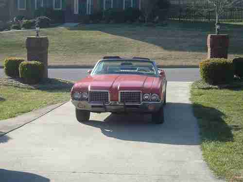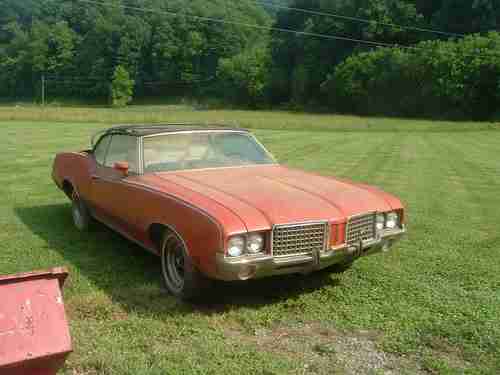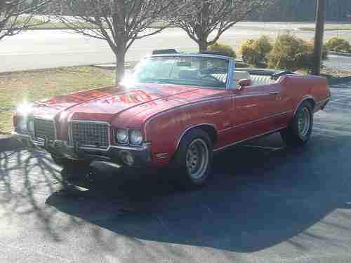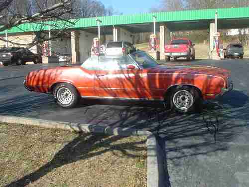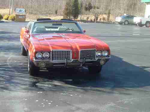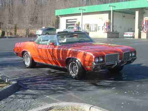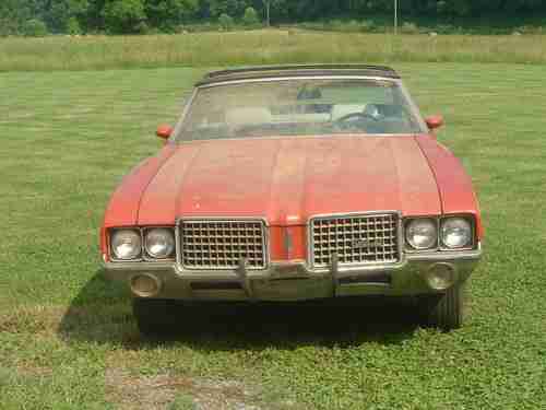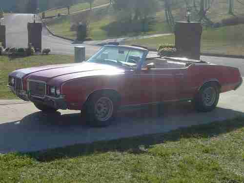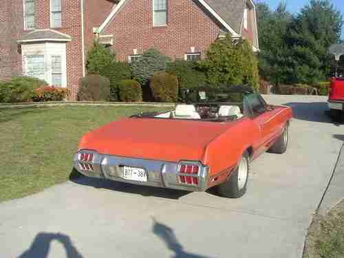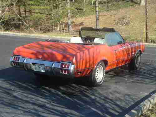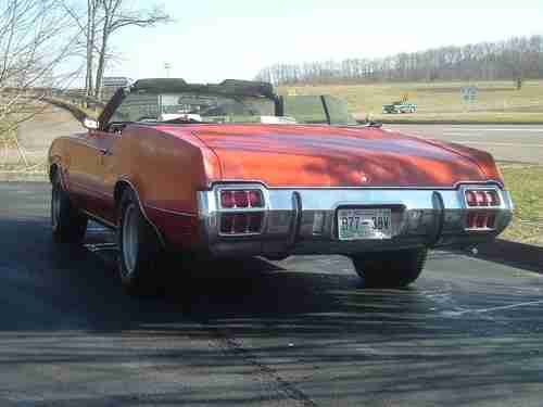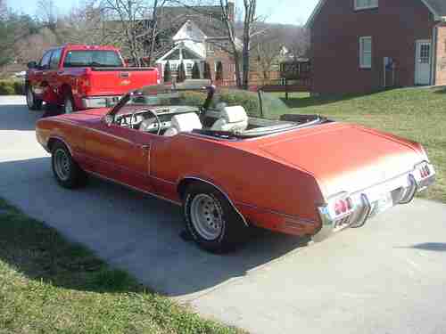 AT AUCTION HERE IS MY 1972 CONVERTIBLE OLDSMOBILE CUTLASS SUPREME. THIS CAR WAS FOUND IN A BARN WHERE IT HAD BEEN SITTING SINCE THE 80'S, CLEAN, CLEAR TITLE, LAST TITLED IN 1977! I REALLY LIKE THESE CARS AND BOUGHT THIS ONE WITH THE INTENTIONS OF RESTORING IT BUT HAVE TOO MANY OTHER PROJECTS AND OTHER THINGS GOING ON SO I'VE DECIDED TO SELL THIS CAR AND PUT THE MONEY INTO MY 1972 CONVERTIBLE CHEVELLE. THIS CAR DOES RUN AND DRIVE WELL, I JUST SPENT A BUNCH OF MONEY HAVING THE TRANSMISSION REBUILT, REPLACING THE WHEEL BEARINGS, NEW MASTER CYLINDER, NEW WHEEL CYLINDERS, NEW CALIPERS, NEW BRAKE SHOES, NEW BRAKE PADS, NEW ROTORS, DROPPED THE GAS TANK AND CLEANED IT OUT, BLEW OUT THE FUEL LINES, HAD THE CARBURETOR REBUILT, NEW SPARK PLUGS, AND SWAPPED OUT THE POINTS DISTRIBUTOR FOR AN ELECTRONIC IGNITION WITH NEW PICK UP MODULE AND COIL. EVERYTHING ON THE CAR WAS WORKING WITH THE EXCEPTION OF THE A/C WHICH IS COMPLETE, JUST NO BELT, COMPRESSOR MAY BE BAD, MAYBE NOT, I NEVER CHECKED IT, BUT THE A/C SYSTEM IS COMPLETE! I ALSO HAVE THE ORIGINAL DISTRIBUTOR AND AIR FILTER REMOVED FROM THE CAR THAT GOES ALONG WITH IT. CAR WAS BOUGHT LOADED WITH OPTIONS WHICH INCLUDE: AUTOMATIC TRANSMISSION, POWER TOP, POWER WINDOWS, AIR CONDITIONING, BUCKET SEATS, CONSOLE, FLOOR SHIFTER, POWER DISC BRAKES, AND POWER STEERING. ONE OF MY FAVORITE THINGS ABOUT THE CAR IS THE COLOR COMBINATION, ORANGE WITH WHITE TOP AND INTERIOR, THE COLORS REALLY STAND OUT AND DEMAND ATTENTION! ORIGINAL 350 OLDS ROCKET ENGINE AND TRANSMISSION BOTH PERFORM WELL, AND OPERATE AT HIGHWAY SPEEDS WITHOUT ANY PROBLEMS, NO NOISES, RATTLES OR ANYTHING. AS CAN BE SEEN IN THE PHOTOS THE CAR NEEDS SOME RUST REPAIR ON THE REAR QUARTER PANELS ON BOTH SIDES, THERE IS A LITTLE RUST IN THE TRUNK PAN, IT HAS BEEN PAINTED WITH POR15 AND LOOKS PRETTY GOOD, I CONSIDERED BEDLINING IT, IT COULD BE LEFT ALONE, OR DO AS YOU WISH, I AM PICKY BUT I WOULD NOT REPLACE THE PAN. THE FLOOR PANS LOOK ALMOST GALVANIZED FROM UNDERNEATH AND ARE VERY SOLID. I DID NOTICE WHILE UNDER THE CAR THAT THE EXHAUST HAS BEEN PATCHED AT SOMETIME, WHICH DIDN'T BOTHER ME AS I PLANNED ON INSTALLING DUAL EXHAUST ANYWAY. THE FRAME IS IN VERY GOOD SHAPE WITH NOTHING MORE THAN THE USUAL SURFACE RUST THAT YOU WOULD EXPECT. THE SEATS NEED RECOVERED, NEEDS NEW CARPET, AND A NEW CANVAS FOR THE TOP, DOOR PANELS ARE PRETTY NICE BUT CARPET AT BOTTOM NEEDS REPLACED, DASH IS NICE, NEEDS A NEW GLOVE BOX LINER, ALL GAUGES WORK AS THEY SHOULD, EVEN THE BUZZER FOR THE KEY SWITCH WORKS! I HAVE THE ORIGINAL OLDSMOBILE SPORT WHEELS THAT CAME ON THE CAR BUT THE TIRES ARE DRY ROTTED BAD SO I PUT SOME OLD ALUMINUM WHEELS AND TIRES ON SO THAT THE CAR COULD BE MOVED AROUND, THEY ARE TOO BIG FOR THE CAR SO THE FRONT ONES RUB WHEN TURNING DEEP. THE BUMPERS ON THE CAR HAVE SURFACE RUST AND COULD STAND TO BE RECHROMED OR REPLACED. WHEN I BACKED THE CAR OUT OF THE GARAGE TODAY THE POWER WINDOWS STOPPED WORKING, BOTH DRIVERS SIDE ARE DOWN AND BOTH PASSENGER SIDE ARE UP, PROBABLY A BLOWN FUSE, I WOULDN'T THINK ANYTHING WOULD HAVE HAPPENED TO ALL FOUR AT ONCE. I'LL TRY TO CHECK THEM OUT BEFORE THE AUCTION IS OVER. IF YOU HAVE ANY QUESTIONS PLEASE ASK PRIOR TO BIDDING. THIS WOULD BE A GOOD CAR FOR SOMEONE INTERESTED IN A DRIVER. WE HAVE DRIVEN THIS CAR AND IT DOES VERY WELL ON THE HIGHWAY. READY TO BE DRIVEN, ENJOYED, AND RESTORED TO WHATEVER LEVEL YOU DESIRE. THANKS FOR LOOKING.