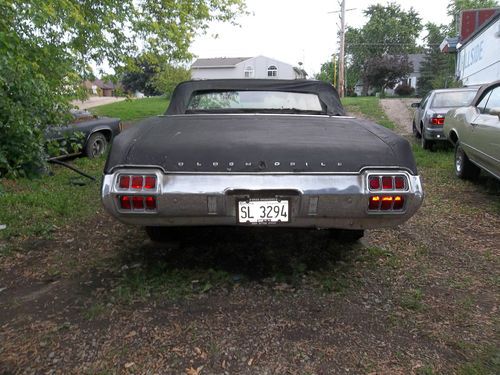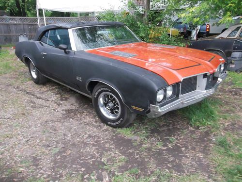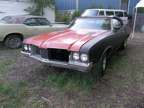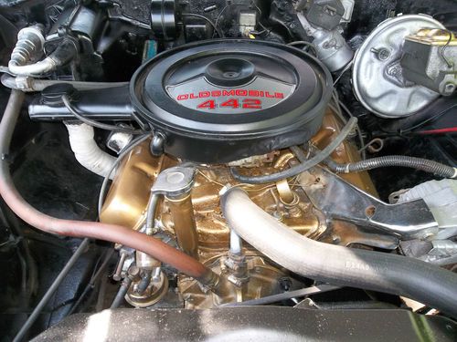 1972 Oldsmobile Cutlass Supreme Convertible "442" or "Hurst Olds" Clone This Oldsmobile up for auction is the perfect candidate for a 442 convertible recreation, or a tribute to the incredible 1972 Hurst Olds "Indianapolis 500 Pace Car Convertible" at a very affordable price. An aftermarket fiberglass ram-air hood can be purchased for around $500, a whale tail spoiler for about $250, and a cut-out rear bumper for approximately $300. Let's not forget the trumpet exhaust tips for under $100, so for a little over $1,000 you can have those nice new parts to install while the transformation is being done. This convertible has the vented hood like what was ordered on a 442 without the ram-air hood. This is the same hood that came standard on all 442's in 1972, unless it was ordered with the forced air-induction W-25 ram-air hood. I'm a huge 442 fan, so I know all the prices firsthand. I've done many of these conversions, and know how the finished product can be very satisfying and rewarding. All the money invested along the way of the restoration process will only add to the value of this car. These 60's and 70's muscle cars have incredible investment potential, and have been referred to as rolling bank accounts. Remember, When the top goes down, the price goes up! You simply need to own a body to install those easy to obtain parts, and some knowledge of the restoration process. This auction is just in time to buy that muscle car convertible that you have been needing for parts, or if you wanted to have a cool old classic to restore. This Oldsmobile would be great for a parts car, but I never destroy cars that I think can be brought back to their former glory. The restoration or demise of this sweet old classic will be left up to the next owner. This car came factory with dual sport mirrors with the drivers side being remote controlled. It also has an Olds sport steering wheel. I've included a pair of original used Cutlass Supreme grilles, and a pair of original grilles painted black like on the Hurst Olds model. The body is currently in black primer, but this is an original code 14 Silver Pewter car, and has a black top, and the black bucket seat interior. I think it would look great triple black with white or gold 442 stripes. I'm selling this cool old drop top as needing a complete restoration to be made into a nice car again. With the black interior it makes this car easier to transform into that Hurst Olds that you've always wanted. The convertible top will need to be replaced, but the frame seems to be in good condition. Some vinyl material was put in place on top to keep the rain from entering the interior in case of rain. Basically, everything will need to be gone through on this car. According to the previous owner, this Olds does have the original numbers matching Rocket 350, and I double checked to make sure. He was telling the truth! This is absolutely the numbers matching block that someone started to do some detail work. I checked the casting numbers, and they are 39558, so this is the only block used in 1972. Only 1,025 of these Cutlass Supreme/442 convertible's were made with an automatic transmission in 1972 making this is a very rare and highly sought after model. I doubt there are too many left with the numbers matching engine. I have not heard the engine run, but the prior owner said it did run very well within the past 2 years. He had owned the car since the 1980's, and it was last licensed in 1991 as seen from the rear license plate picture. Yes, The Beer Drinkers Make Better Lovers license plate frame is included. I did put a hot battery in it, and it did turn over strong, but doesn't get any spark. The carburetor is a like new Holley, so it shouldn't be too hard to get this car running. There is a 4-barrel quadrajet carburetor in the trunk that I'm assuming is the original that would need a re-build. I recently purchased this car in a package deal, and I don't have the time to mess with it, or the room as you can see from all the projects in the backround. This 1972 Oldsmobile Cutlass Supreme/442 convertible is a very unique car to have. Whether this model is a real 442 or a converted Cutlass Supreme it is still considered to be like a real 442 if it is converted properly. I'll give a little background on the 1972 Oldsmobile Cutlass Supreme, Cutlass S, and 442 models. Prior to the 1972 model year the vehicle identification numbers in all 442's started out with 344. That was the way to determine whether that specific car was ordered from the dealership with the 442 option. This is easily verified by the OldsFaqs website that anyone can look up online. The 442 could be ordered as a separate model for the last time in 1971. Oldsmobile decided to make the 442 an ordered option starting in 1972. The OldsFaqs website makes the statement that there is no such thing as a fake 442 in 1972. All 1972 442 convertible models started life as a Cutlass Supreme, since the 442 was an ordered option. Whether the car was factory ordered as a 442, or dealer installed, or a private owner installed all the 442 options, they are all considered Cutlass Supreme or Cutlass S bodies. This is why all 1972 442 convertibles have Cutlass Supreme on the glove box door, and all 442 hardtops have just plain Cutlass on the glove box door. Brand new aftermarket 442 grilles are available new, or they appear on eBay as used originals every so often. I saw no signs of this car ever being involved in any major accidents. I believe all the body panels to be original to this car. There is a great set of four P235/70R15 Uniroyal Laredo raised white lettered tires with very nice tread mounted on 15 inch Super Stock II wheels painted in gloss black. All four wheels have the center caps, and the beauty trim rings. There is a 10 bolt rear-end, but I am unsure of the gear ratio. There is a pair of air shocks on the rear suspension that seem to be holding air nicely. The original trunk floor will need some repair, and