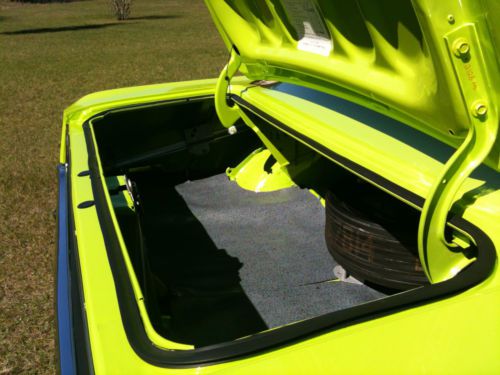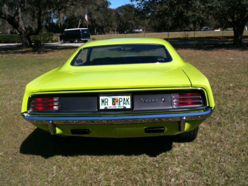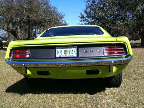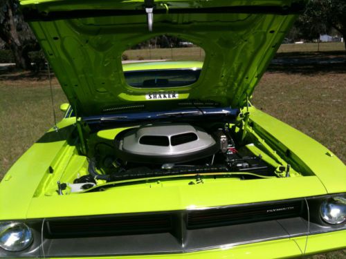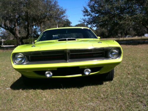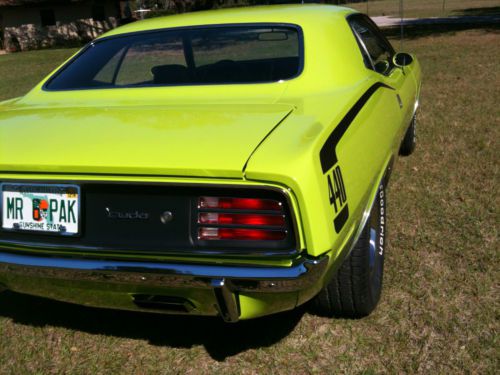 You are bidding on a used, fully restored, better than showroom new condition 1970 Plymouth Cuda, 440-6Pak, matching numbers car. Drivetrain includes a slap-stick shifter four speed transmission, Dana 60 rear with original Super Track Pak 4:10 ratio gear. Original Shaker Hood, 15” X 7” Mopar Rallye wheels with BF Goodrich tires. Power disc brakes, Power steering, TTI exhaust with correct stainless tips, and Electronic ignition. Paint is PPG FJ5 Limelight base/clear coats. Never washed, only detailed since restoration. All new black correct interior. Car has 47,000 original miles and only 750 miles since a full rotisserie restoration was performed in 2011. Current owner has had the car for nearly 20 years and spent all that time collecting parts and preparing the car for restoration. Car was raced for most of its years, before current owner purchased and began restoration. Always inside, garage stored since restoration. Owner is available for questions by phone between 5-9pm eastern time, call Larry at 863-557-7088. |
