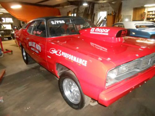 This is a 1970 Plymouth Duster Pro-Street car. This has no title will be sold with a bill of sale. This car was originally had a 340-4 speed. Car is equipped with line lock and trans brake with a Cheetah SCS shifter. This car has braided lines for the fuel lines and this also has the hookup for Nitrous with braided lines. We have the stuff for the Nitrous hookup but we have not had this hooked up. This has a fuel cell and battery in the trunk. There is post to hook up battery charger on the rear of the car without removing trunk. Has an electric shut off on the rear also. This has fiberglass racing seats with a 5-point harness and an 10 point roll cage. Has a 9000 rpm Monster rpm gauge with shift light have chips to switch the chip. Has the MSD ignition with two step module. This car is red with a black vinyl top. The car has been back halfed. Tires on rear are 31 x13-15 Goodyear Eagle Dragway specials has 3.91 gears. Tires on front are 26.0/4.5-15 MT. Has fiberglass front and rear bumpers. Fiberglass hood and fiberglass trunk with a wing off the back. Car has frame connectors. I am sure that there is other goodies on this vehicle that I have forgotten to mention. The Stickers that are on the car do come off this car is red with a black vinyl top. This car has full carpet inside the trunk also has carpet and a carpeted cover for the battery. This car has been done right. We have done 11 seconds with the current setup. We are selling this without the motor with a good motor and right gears this would be a 10 second car. You cannot build this car for this price. You can call us at 319-721-4732 with any questions. Buyer is responsible for shipping. $1000.00 deposit due within 24 hours after close of auction can do a bank transfer. Remainder to be paid before car is picked up.
