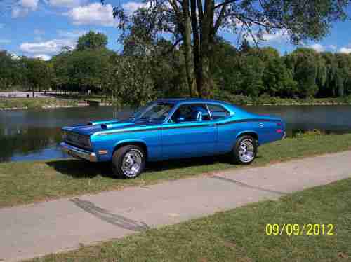 up for auction is a very nice 1972 plymouth duster that was rotisserie restored. It is not numbers matching but is period correct 340, it is a four speed manual trans. with pistol grip shifter, 3:55 positraction rearend. it has bucket seats and a shark tooth grill, hood scoops, exhaust manifolds, flowmaster exhaust. the body is laser straight and the paint is b-5 blue and the interior is also b-5 blue. it has all new suspension the underbody is as clean as the rest of the car. it has new cragar rims and bf goodrich tires. the car only gets driven to and from car shows and it has won a trophy at every car show i've taken it to. you will not be disappointed in this car, it drives straight and smooth. it has a clear title. I think i've covered every thing but if you have any questions you can contact me through e-bay or call (810) 955-1019 but please no calls after 10:00 pm thanks mickey . i do have this car for sale locally so i do reserve the right to end this auction at any time.