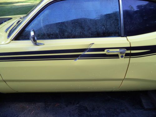 PLYMOUTH DUSTER CLEAR CALIFORNIA TITLE~SOLID NO RUST 6 CYLINDER~NEEDS UNDER THE HOOD WIRING TO GET THE MOTOR RUNNING AGAIN CAR NEEDS SOME WIRING,INTERIOR,COSMETIC PAINT~NO INTERIOR,DRIVERS DOOR HAS DENT AS PICTURED THIS WAS A 340 CLONE PROJECT,DUE TO INNESS IN THE FAMILY,MY LOSS IS YOUR GAIN BUYER SETS UP SHIPPING NO REFUNDS OR RETURNS YOU BID YOU BUY YOU OWN AS IS WHERE IS ~NO WARRANTY |