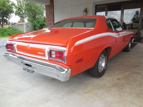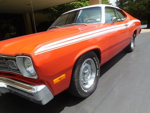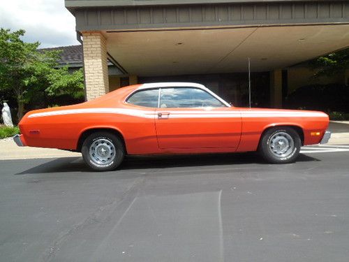 I found this car sitting in a private garage of a very informed collector last year. He had several top notch Plymouths in his collection. I asked how he bought the car... He told me he got it from the grandson of the original owner. He told me that the car was to his knowledge a true 37k original mile car. The grandson had painted the car when he inherited the car. Although I cant sell it as an original mile car because of state of Illinois laws, I can say one thing, this drivetrain is incredible and I have NEVER drove a Duster that handles like this one. I had no questions and bought it right on the spot. I have taken it to my top mechanic, and we inspected it and found that someone had invested a lot of money in this car. Some of the new parts includes...all suspension, shocks, ball joints, bushings, after market sway bar... All new seals in the transmission, front seal, an gasket, filter, shift shaft seals...we believe the interior to be original and in the best shape original interior could ever be.....The carpet must have been dyed at one time because it looks as if it is brand new.....This car handles incredibly and not as you would expect a car of this age to drive. I would have no problem getting in it and taking off to California. This is a real AIR car, and the air blows cold. You can tell it has spent most of its life cared for and garaged beautifully. I have only had it for a year and only have taken it to shows. It turns heads at every street corner I stop at. The only reason I am selling it, is I found a 1971 true 440 GTX that I am going to rebuild, and it will take me everything I have to make that a 100k car. The BF Goodrich Radial TA tires are in great shape and so are the rally wheels. The trunk is cleaner than my girlfriends 2012 truck. For the collector that has been searching for a true classic that could be used as both a daily driver, or something to take to the weekend shows. At the price I am selling it, you will be very hard pressed to find one nicer. I can assist in national and international shipping. Cash or bank wire only. Clear Title. Please feel free to call me if you have questions and are interested in purchasing and I will get back with you as soon as possible or call 618-567-6785.