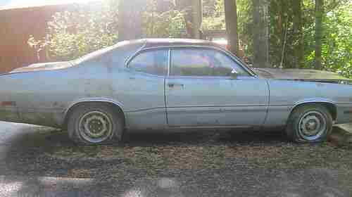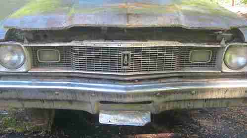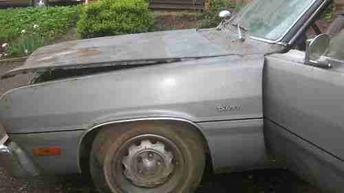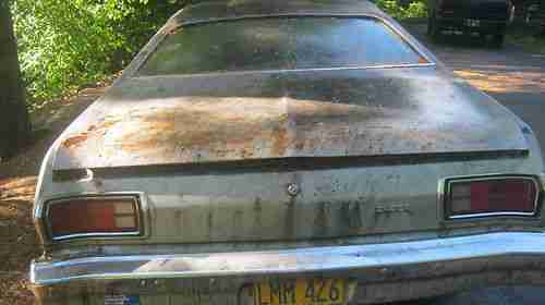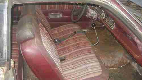 I am helping an elderly family friend sell this vehicle. This gentleman bought this car new in 1976. He parked it behind his barn in approximately 1987, because he thought the transmission was making a funny noise. It has not been driven since. It has a vinyl roof that looks to be in good shape. The seats look to be in good shape. The seats are complete, with no rips or tears. The interior carpeting is gone. The gentleman tells us that everything on the car is original. However, he says that he had some small "dings" repaired by a body shop a few years before it was parked. It was parked in grass and was covered in a tarp, which has led to some surface rust. The paint is in rough shape. The gauges and emblems are present and in good shape.