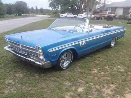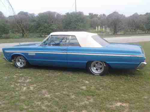 Up for auction is my 1965 Plymouth Fury 3 Convertible. The person I bought this car from started restoring this car .I do not have documentation to prove this. all I have is his word and he said he sent the car to a paint shop,interior shop and mechanic shop to have it restored and he had about $25,000 invested in it .It has a rebuilt 383 engine and a 3 speed automatic transmission ,it has fairly new paint and interior about 2 years old ,new wiring harness ,new brakes and it seems to have all new bushings and bearings in the frontend ,it has manual drum brakes ,manual top, the top is electric but it needs repairing . The top also needs some repairs ,(the ribbon above the rear window is gone and the rear window seems it may have shrunk a little bit. this is something I think he did not restore)also the radio is not in the car but i do have it ,I also have the inserts for the rear wheel wells ,and the rear bumper is in need of rechroming. Other than these negitive things this car runs and drives perfect ,if someone was to fix these few things they would have a real show piece ,If there is any thing I can help you with please email me