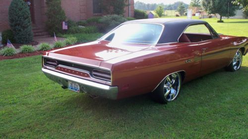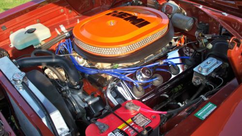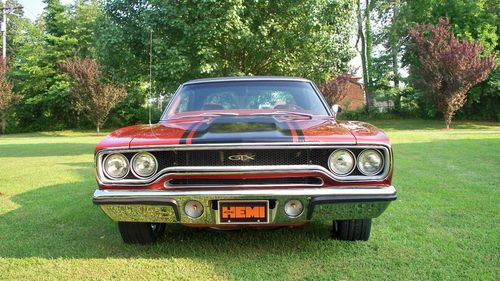 Up for auction is my 1970 Plymouth Hemi GTX. No expense has been spared in this ground up restoration. Almost everything on the car is either new or been restored. I will try to list as much as I can: The GTX was originally a factory Burnt orange 440 car and I do not have the original engine. A new factory 426 Hemi crate engine from Mopar Performance was installed about 3 years ago and runs strong. It has two Edelbrock 600 carbs with aluminum intake and linkage package from Mancini Racing. All pulleys, brackets, lines, belts, and hoses are new. New Hemi air cleaner with decal, new exhaust manifolds with Flowmaster 40's run out back with chrome tips, new Champion aluminum radiator keeps it cool. Automatic on factory column, 8 3/4 rearend has 489 housing with 3.23 gears and new Auburn positive unit helps it cruise down highway and ride smoothly. It has a Hemi K-frame, factory heavy-duty suspension and large drum brakes all around. New master cylinder, gas tank, chrome bumpers, grille, emblems, side markers, taillights, bezels, and front and rear turn signal lights. The body has a new black vinyl top and the trim is new or replaced. Many GTX pieces are hard to find and expensive. Interior has been put back original burnt orange with new Legendary seat covers, door panels, carpet, headliner, armrest, trunk mat, new gauge faces and new Tic-Toc-Tac all from Yearone. The fender tag is missing, however, the vin matches the radiator support and trunk lip. This is a true GTX, not a cloned Satellite. The paint has a few small nicks or scratch, but overall nice and shows well. Wipers do not work. Wheels are Foose Legend 18s with Nitto tires. There's no warranty expressed or implied. This car gets attention wherever it goes, gets many thumbs up and sounds great! I would not classify it as a show car, but has won many awards at local shows. Now you can experience being swarmed by people looking at the ONLY Hemi car at your local show or cruise-in! Good luck bidding!