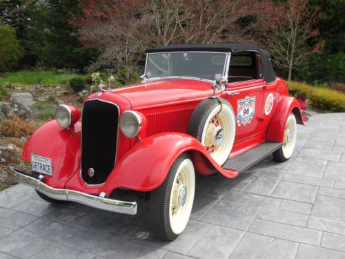 1933 Plymouth PD rumble seat Convertible Great Race car. This is a very rare beautiful fun driving eye catching car, only 4596 convertibles were produced in 1933. This car competed in the Great Race twice, the first year was in 1995 it went from Ottawa, Canada to Mexico City. The next race was in 2004 it went from Jacksonville Florida to Monterey, California. Each of these races was approximately 4,500 miles each and the only issue the car ever had was a broken fuel line in Mexico. This car was meticulously put together by its former owner and his personal mechanic. I have a tremendous file documenting the history of the car back to the mid 60’s. The car is extremely road worthy and has had a lot of upgrades mainly safety issues for the great race. Some of those features are seat belts, suicide door locks, auxiliary electric engine fan, 12v system, electric wiper motor and turn signals. It does have 34 PF motor in it.