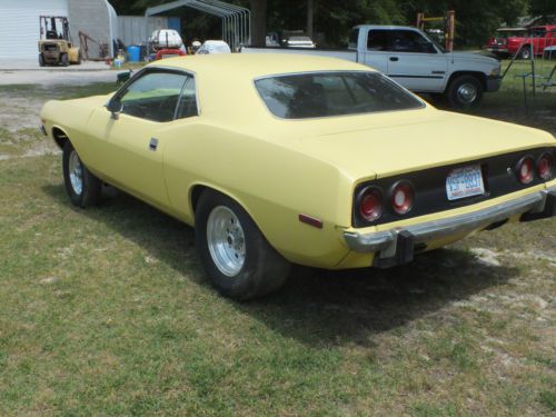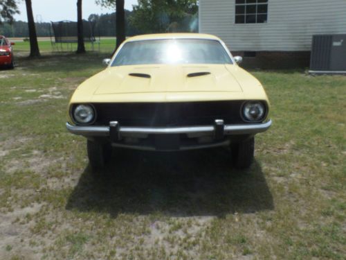 **** 1973 Phymouth Cuda**** Up for auction is a 1973 Plymouth Cuda. The car is an orginal 340 car with an automatic transmission. I do not have the orginal motor or transmission for the car. The body of the car is in overall good shape. The frame is in good condition. The floor pans look good. The trunk pan has a small hole that could be patched at this time. It is a project car so it will need some body work and of course it will need painting. The car is shown in a yellow sealer. The car comes with: Well Racing Rims, Mickey Thompson Street Radials, and Flow Master Exhaust.
