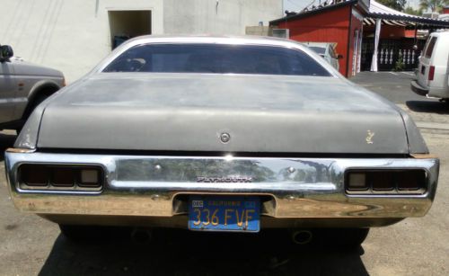 UP FOR BID, 1973 Plymouth Roadrunner California car with 68,475 original miles. Car was a daily runner when I purchased from previous owner. I have had about 3 months. I wanted to keep as is, but lack of work forces me to sell. Car runs and drives good. Brakes could use some work. Currently licensed, have clear paper title and fender ID tag. You can drive this car on the street tomorrow. ENGINE 440 (not original) Slight cam Turbo mufflers with dual exhausts ORIGINAL FEATURES Original A/C which is not connect but I do have the compressor and hoses Power brakes NO power steering Original blue plates Tinted glass MISC. Have key for doors and trunk Trunk lock works hard sometimes Tires 1 year old, fats on the rear Keystone black wheels Original spare tire Original carpet in trunk All electrical good and working TRANNY Original H/D 4 speed manual transmission Pistol grip shifter INTERIOR Rally dash Console AM radio Original bucket seats black viny Original rear seats and carpeting NO RUST on interior floors Power windows and they all work Aftermarket Grant wood steering wheel Driver side seat has broken hinge and will need to be fixed EXTERIOR Gray paint with red body sport stripe (fender code says paint was JF1 which was light or mist green with white body stripe) Hood tie down pins NO RUST on exterior nor in the trunk Dent on passenger door repaired, however I have a new door with glass if you want to replace Trunk lid has slight dent and also have new truck lid if you want to replace The is also a dent on the right rear fender Chrome bumpers in excellent shape Missing the strip that goes above the rear bumper (see pic) Email me for any questions or more detailed pictures. Above is all I know about the car and engine. Car is for sale locally so I reserve the right to end the sale early. A $250 non-refundable deposit is due with 48 hours. I really hate to sell as I told previous owner I would not, but I have no choice. It's a great original muscle car. |